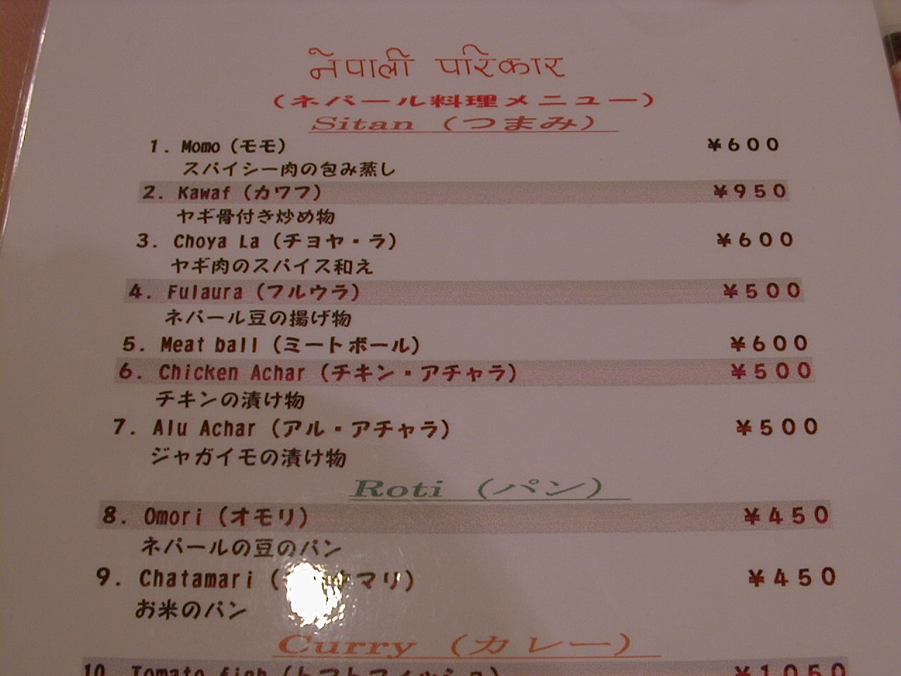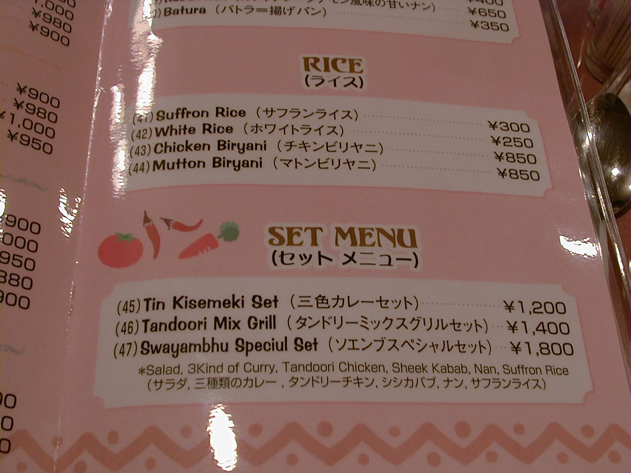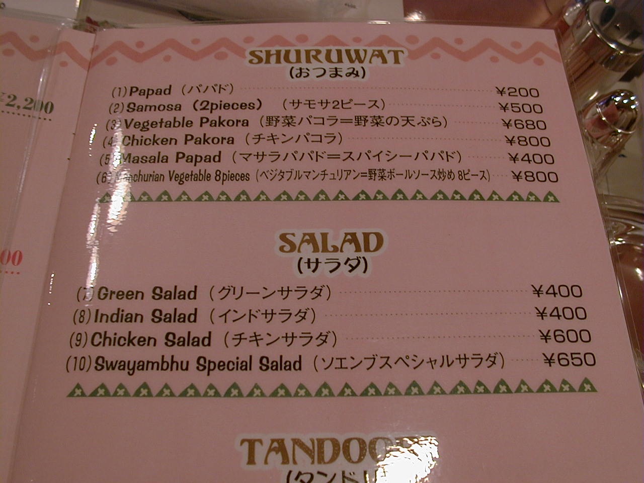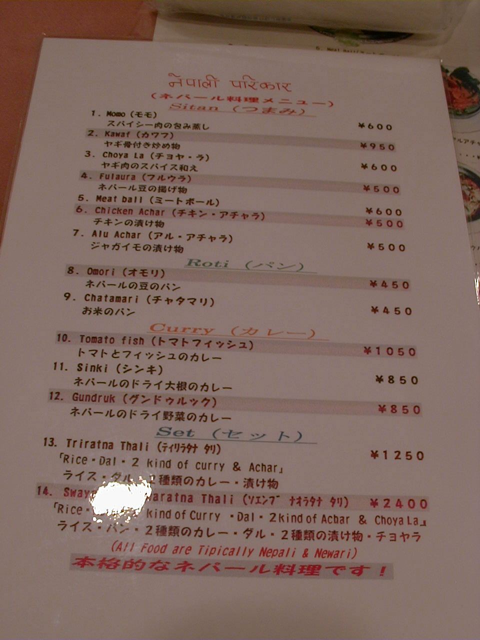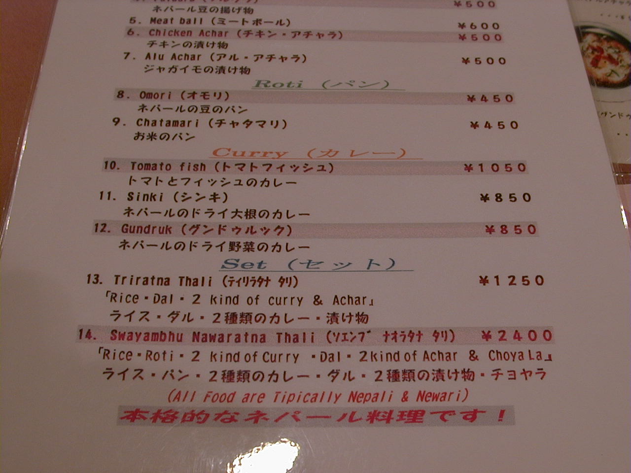 2001/4/7: ソエンブ(SWAYAMBHU)のメニュー