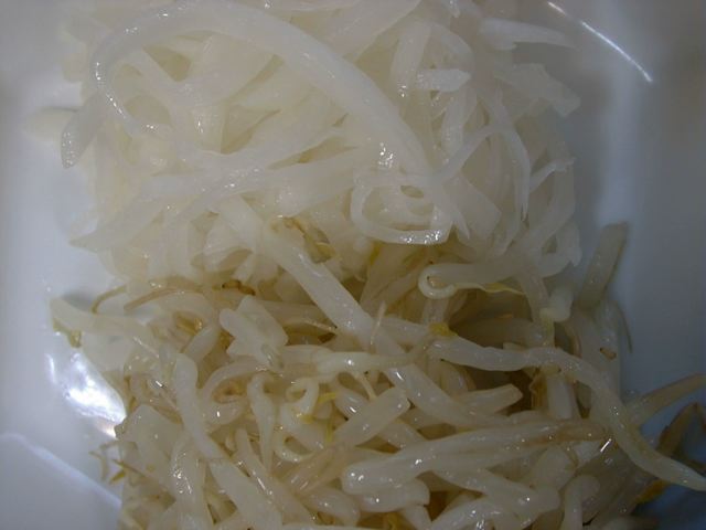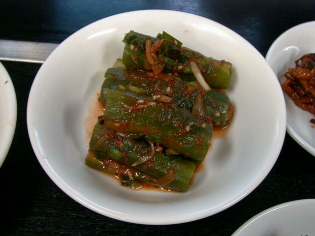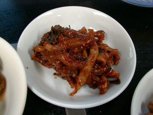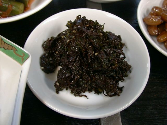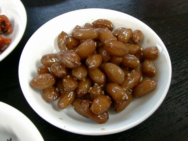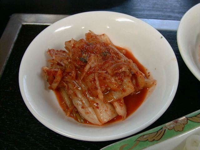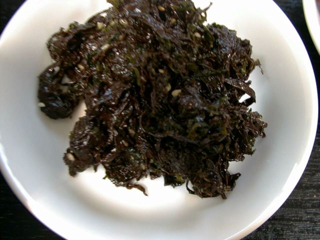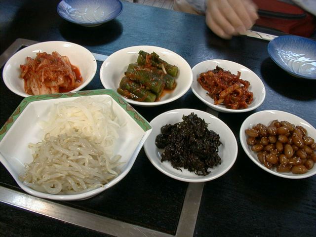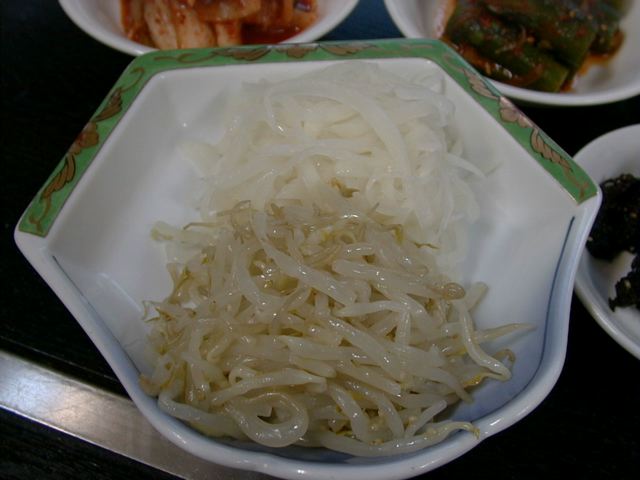 - 大根ともやしのナムル、のり、ピーナツ、白菜キムチ、オイキムチ、ごぼう?、白身魚