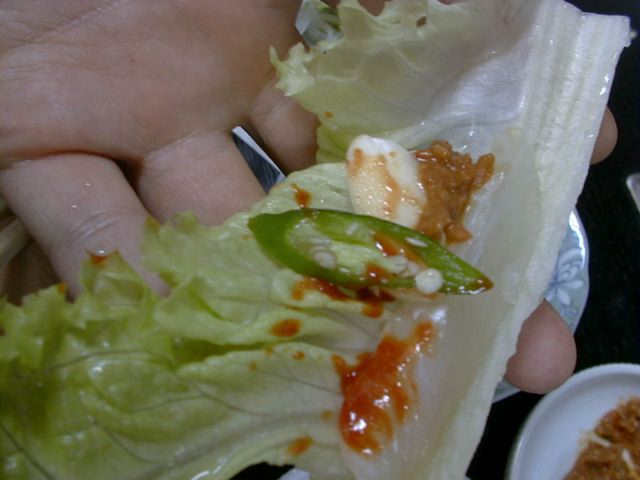 - こんなふうに、葉っぱに味噌とにんにくを巻いて食べます。 唐辛子はかなり効きます。(い)