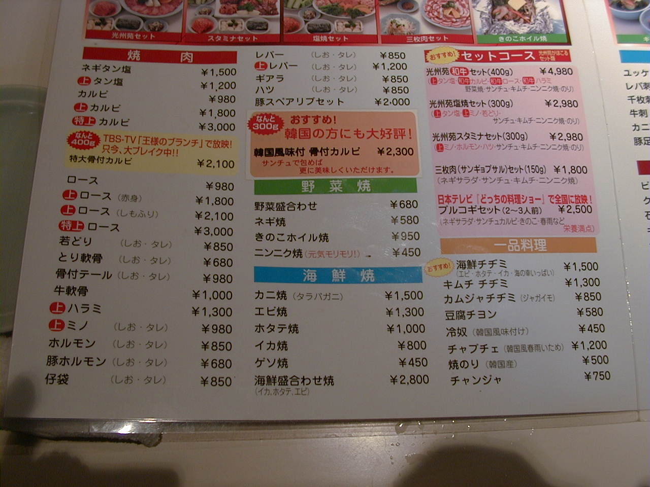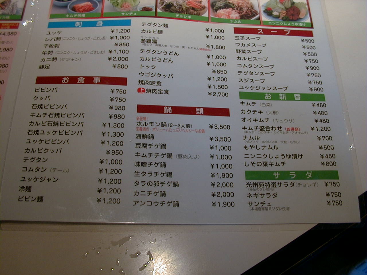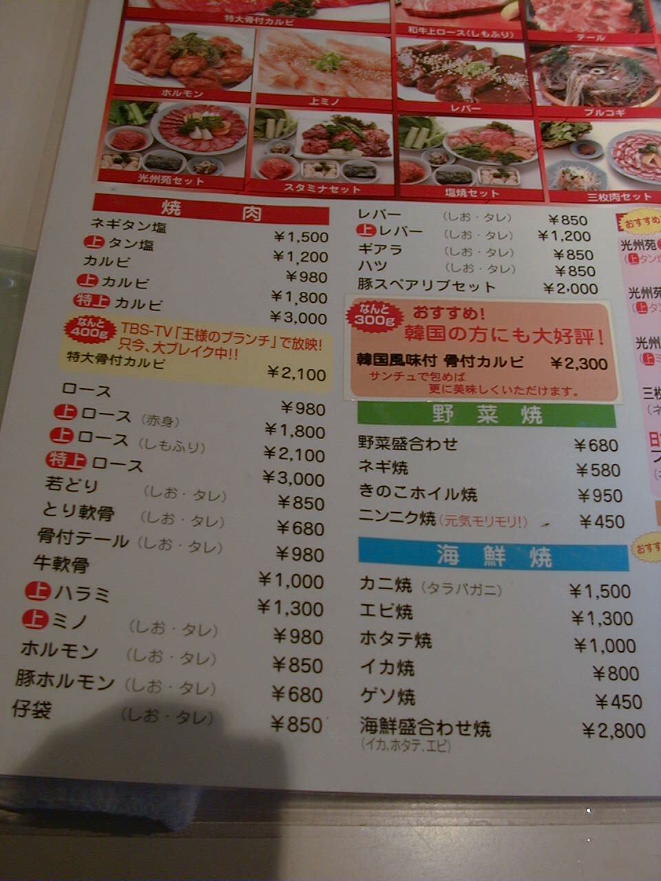 2001/5/12: 焼肉光州苑のメニュー