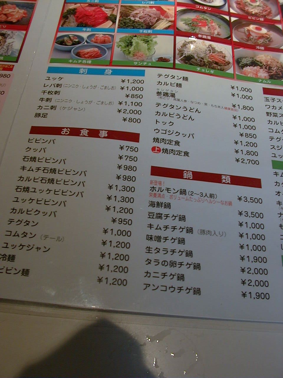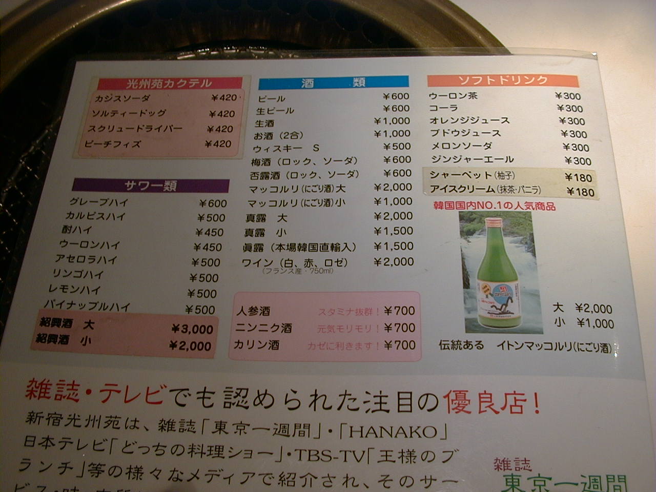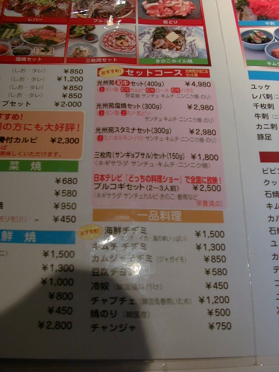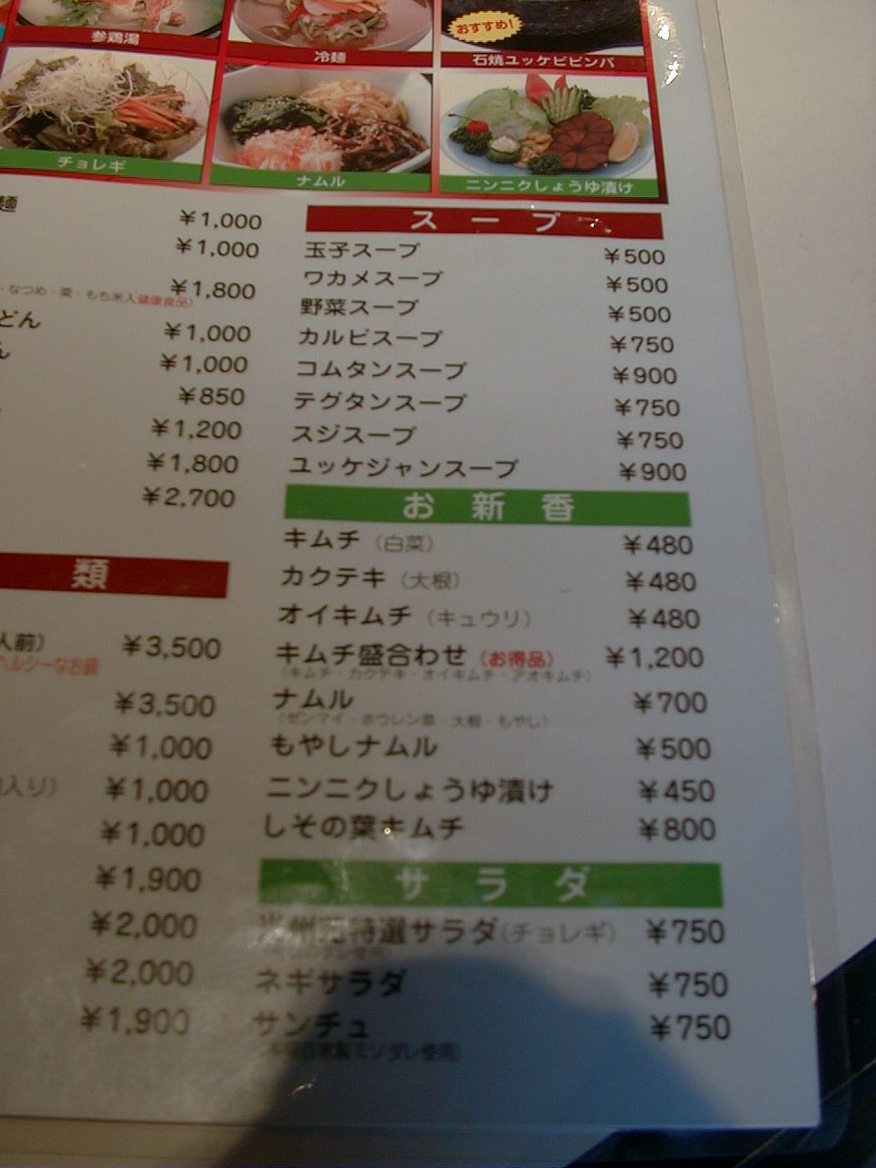 2001/5/12: 焼肉光州苑のメニュー