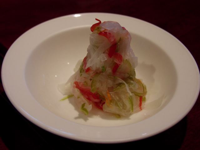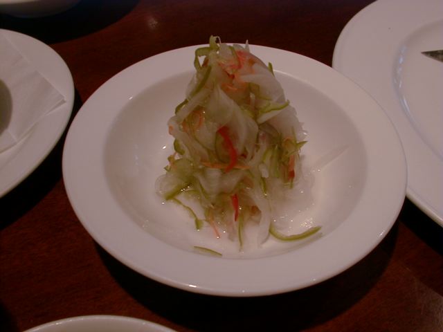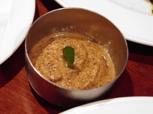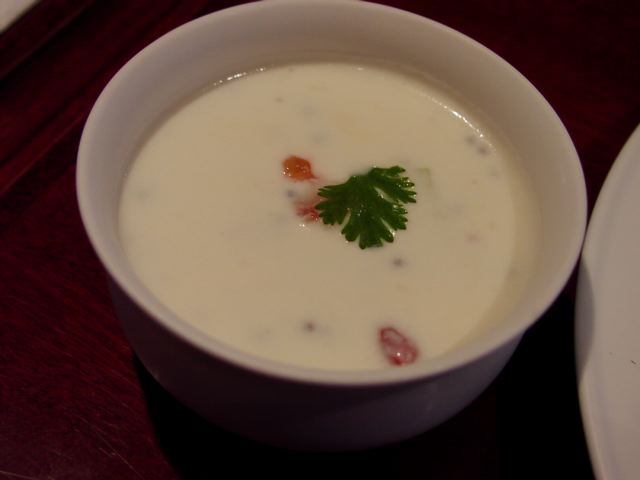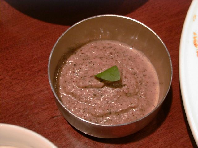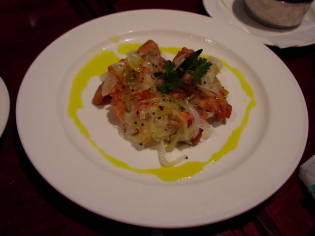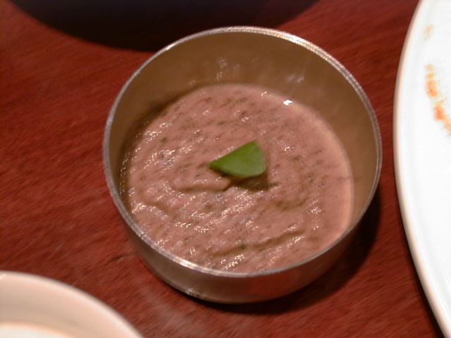- もー料亭なんだか、フレンチなんだかって見た目です。他店で食べるようなアチャールとは全然おもむきが違います。どちらかというと日本の浅漬けに近い薄味でした。もちろん印度のスパイスは使われてますから何とも初めての味でした。以前この店でいただいたアチャールとも違ってたと思うので、初夏向きにさっぱり目につくられたのかもしれません。極薄、極細にスライスされたお野菜が余分な水分を絞られてこんもりきれいな山型に盛られてます。(az)