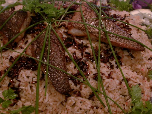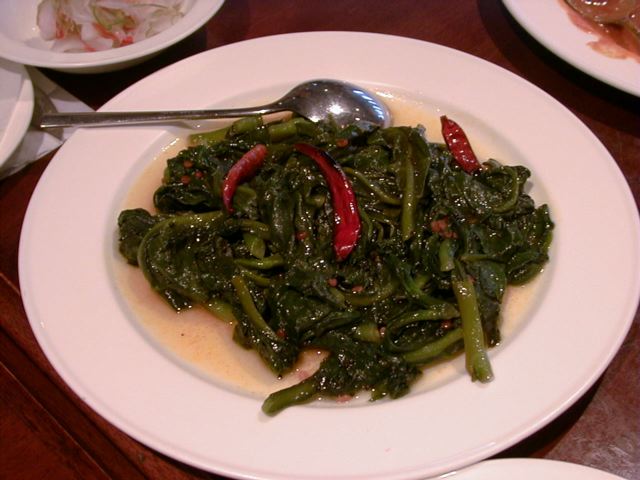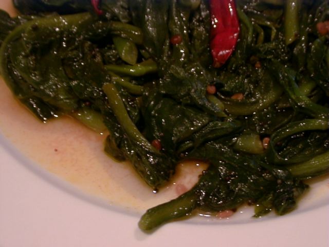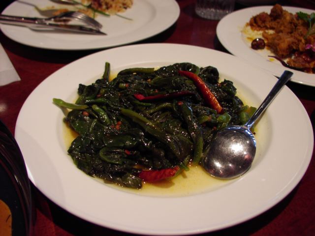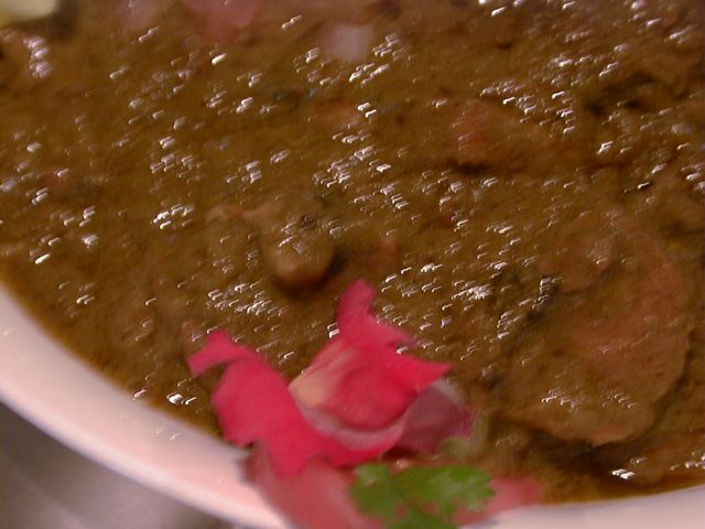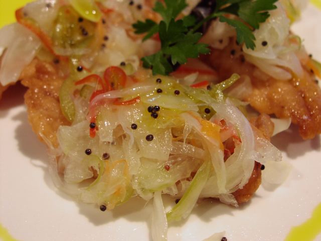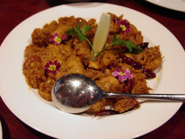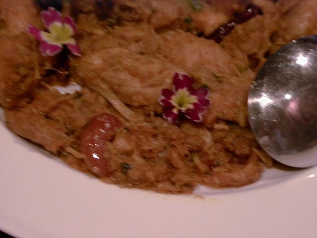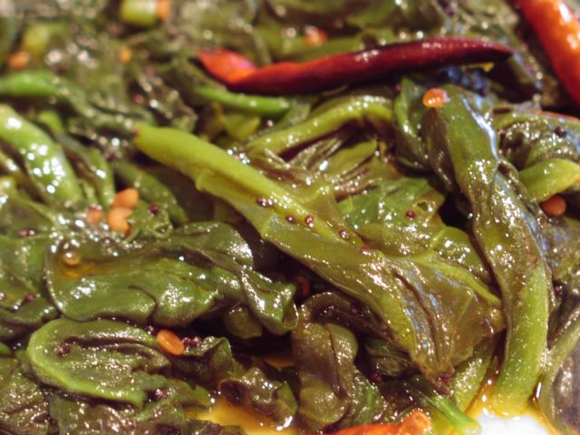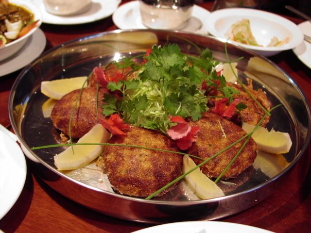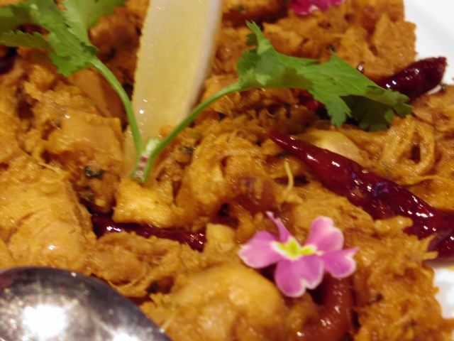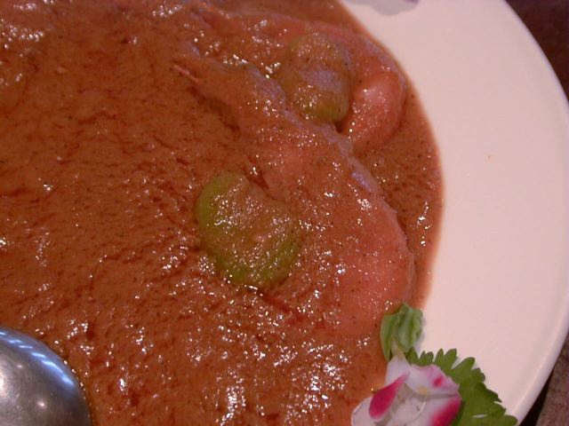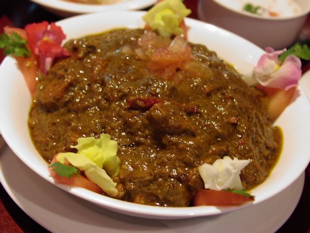 - ちょうど季節というので用意してもらいました。鰺の前菜よりはずっと多くマスタードオイルが使われてます。そのせいでつるむらさき独特のえぐみがかなり緩和されるそうです。ほうれん草などの葉っぱ系特有の青臭さが好きな私は緩和され過ぎて個性がなくなってたらもったいないなぁと案じましたが、ちゃんとつるむらさきらしさは残ってたので安心しました。チリの辛みとはまた違うマスタードの辛みと葉野菜がマッチして一皿全部平らげたいくらい好きでした。ちなみにマスタードオイルは日本料理などでのごま油のように「仕上げの香り付け」に使うといいそうです。店主様が修業時代には日本ではマスタードシードが全然なく、この代用品となる油に頭を悩ましたそうです。もちろんマスタードシード以外のモノでも今と違って入手が困難だったのでレシピどおりのものが作れず、色々考えたとのことでした。(az)