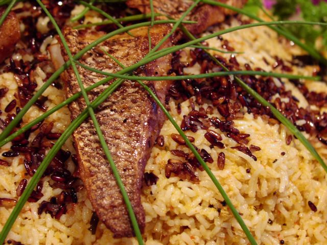 - (タンドールで色好く焼きあげた鯛がライスにのってますが、これをほぐしてライスに混ぜ込んでいただきます。トッピングだけではなく、ライスの中にも鯛の身がたっぷり炊き込んであります。)