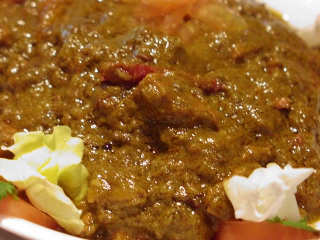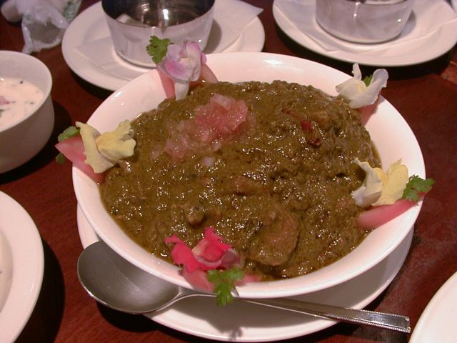 - マトンがピューレ状のほうれん草のカリーに入ってます。好みで言えば、食感の楽しめる形の残ったタイプのサグの方が好きなのですが、マトンのようにちょっと自分の不得手なお肉と一緒の場合には、よーく絡みつくピューレの方が食べやすくなっていいです。(az)