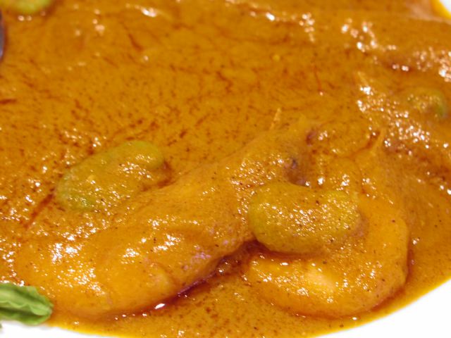 - ソースにしっかり海老のエキス出てます。そら豆は一人一個食べられたかな?ってくらいの数でした。プレーンなバスマティと楽しむといいです。これが私一人の注文の品ならバスマティをどさっと皿にぶちこんで混ぜ混ぜしたかったです。