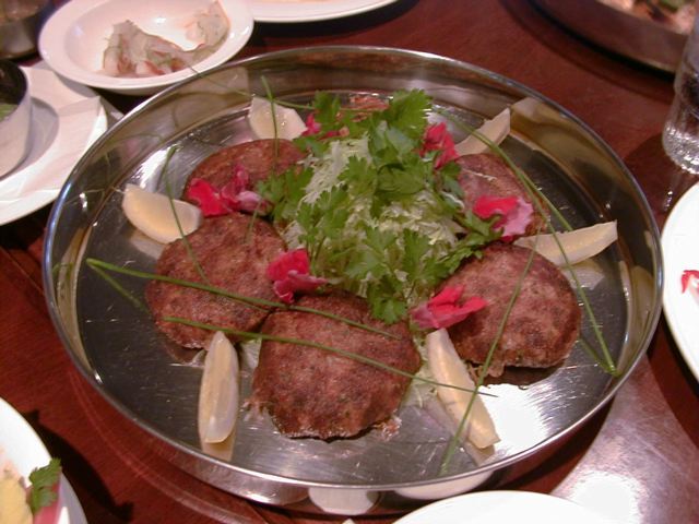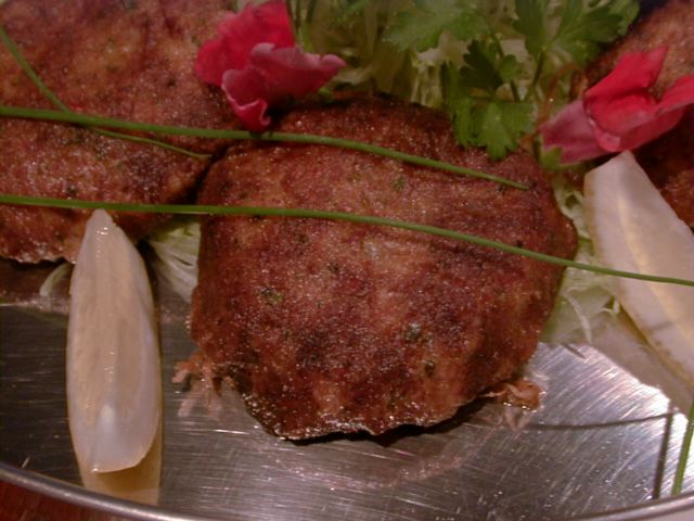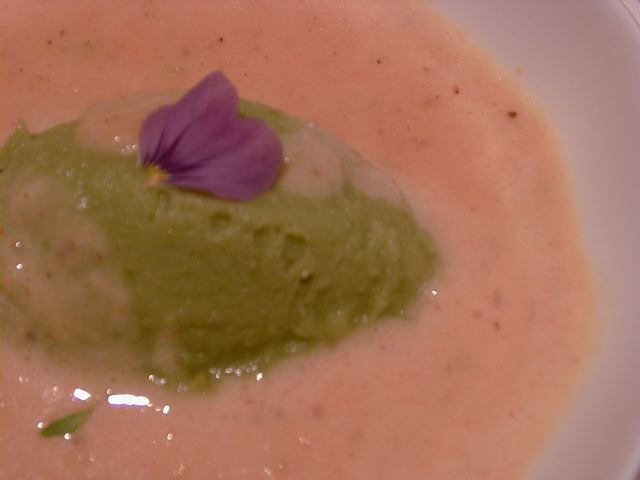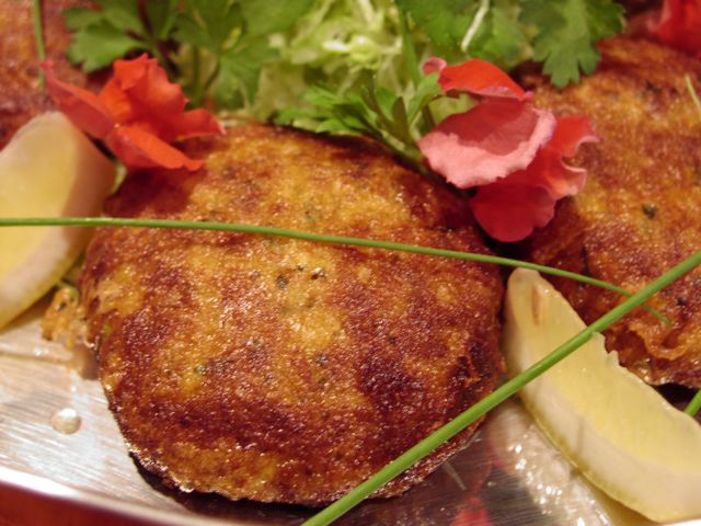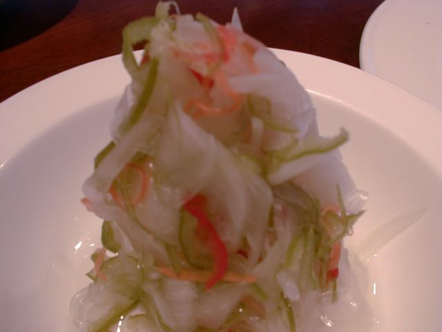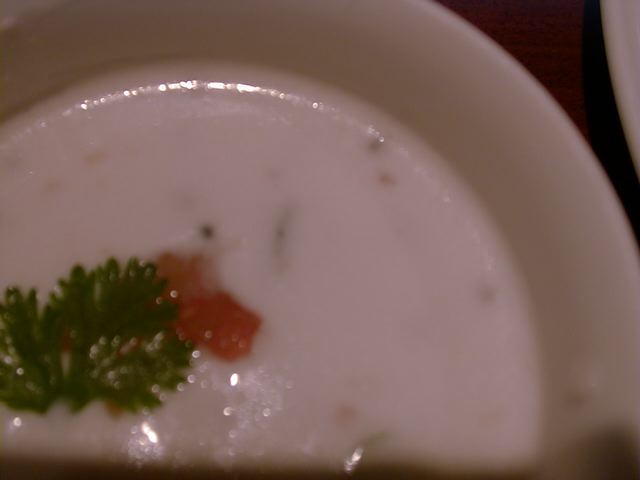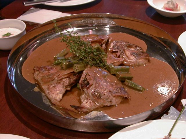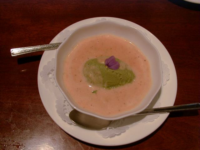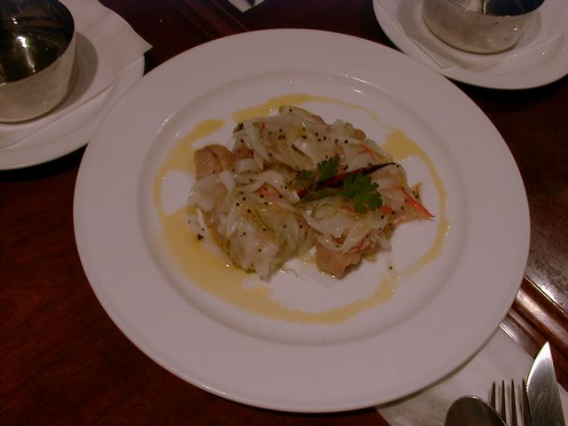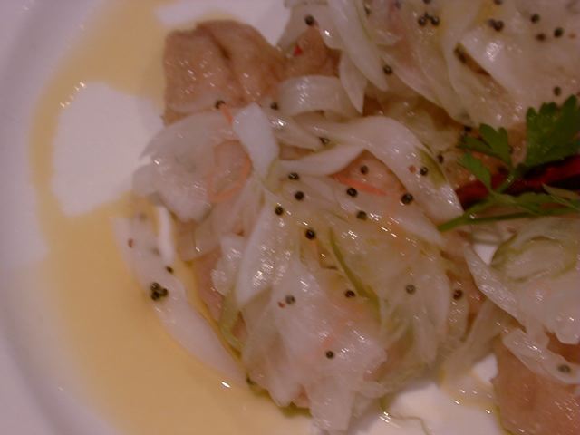 - 私は前菜ってこととは知らず(なーさんは、その料理名からマリネということは想像ついてたそうです)に注文してたのですが、初夏向きのさっぱりした一品です。アラカルトでお料理構成をと考えてる方には、是非注文することをおすすめします。だけど、普段のメニューには載ってないない品なので、行く前にできるかどうか確認してから予約しておいてくださいね。おいしくて参加者の評判も良かったです。写真にあるお料理のまわりにある黄色のリングがマスタードオイルです。このオイルが魚臭さを緩和して上品な仕上がりになってます。(az)