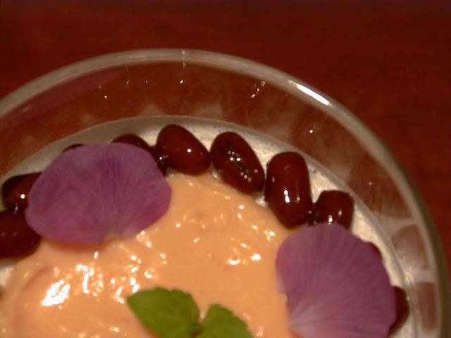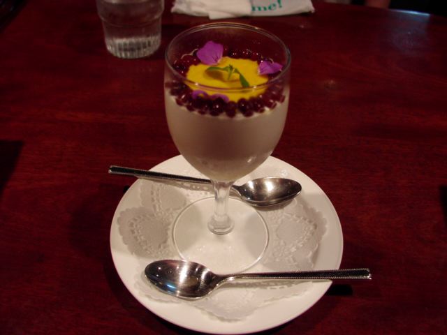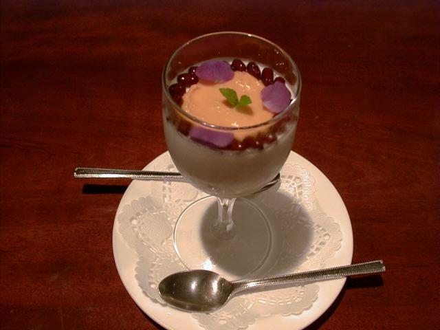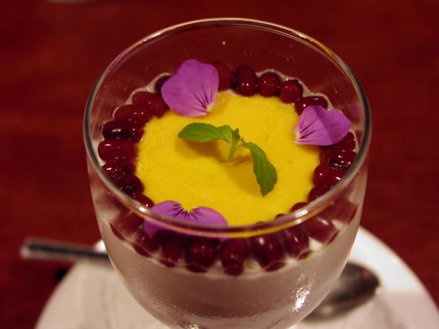 - 一般的に「ブラマンジェ」から想像する固さ(柔らかさ)からさらに固まる途中のふわふわ感が残る食感です。上に飾られた小豆は甘すぎず煮すぎずできれいな形を保ってます。見た目の美しさを出す為の演出なのかもしれませんが、カボチャのピューレ部分はほんのちょっとの量というのと、甘みを抑えてあったので、それほど全体への味の影響は感じられませんでした。個人的にはもっとたっぷりあるか、まったく入れないかの方が「心」をまどわされないで済むのになぁと考えるのでした。(ガネーシュのHPの写真だと結構入ってるようですね。たまたま私たちのは少な目だったのかも。)グラスの底の方にあったムングダール豆の部分ですが、もったり感があってねとっとした食感の違うモノが面白いアクセントになってました。逆にこの豆が嫌だと言う人も居るかもしれないけれど、豆好きの私はもちろん「うれしい派」です。パヤサムにクリームつけて出すっていう単純なデザートがあってもうれしいかも。(az)