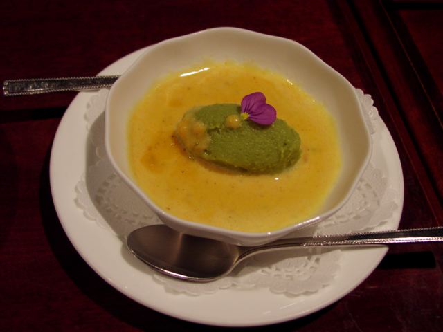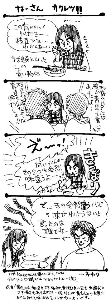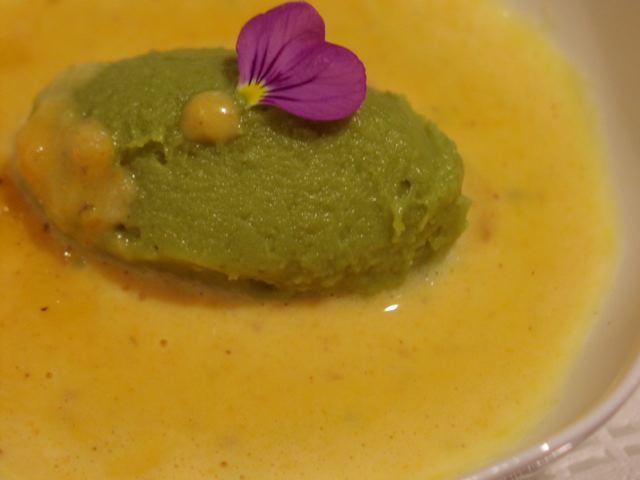 さてさてガネーシュのデザートはぐぐっと甘さ控えめで口当たりまろやかで実に繊細な仕上がりになっています。にんじん臭さもありませんから万人受けするデザートだと思います。青豆のピューレがまたぐいーっと違う方向性にいっていて、交互に食べて楽しみました。冬になるとサツマイモのハロワ(kazeさんの推薦付き)が登場するらしいので、それも試しに行かねばと課題を残すのでした。(az)