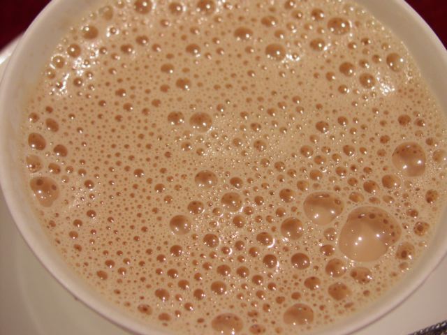 - 今回は普通の営業時間におじゃましたため、店内はお客さんでいっぱいでしたから、前回のように制作(撹拌)中のパフォーマンスを見ることはできませんでしたが、カップの中の泡から、その様子を思い起こすのでした。チャイなどを提供してくれる際にそのパフォーマンスを見たことある人もいるかと思いますけど、二つの器間をかなりの高低差を使ってどぽぽぽぽぽぽと移しながら砂糖をまんべんなくコーヒーになじませます。(私がこの作業を実際に見たのは、アジャンタ本店とここだけです。よくあんな口の小さな器間でうまく移動させられるものだと感心してしまいます。他でもやってる店はあるのかもしれませんが、客前でやってくれるところは少ないと思います。)