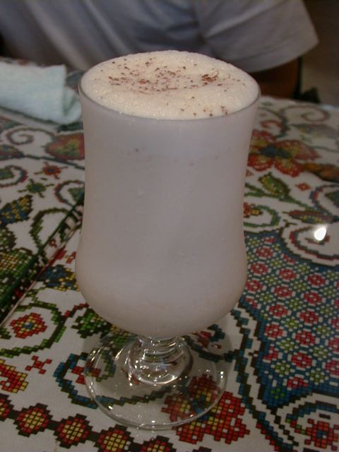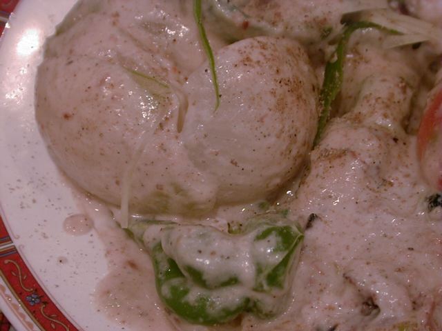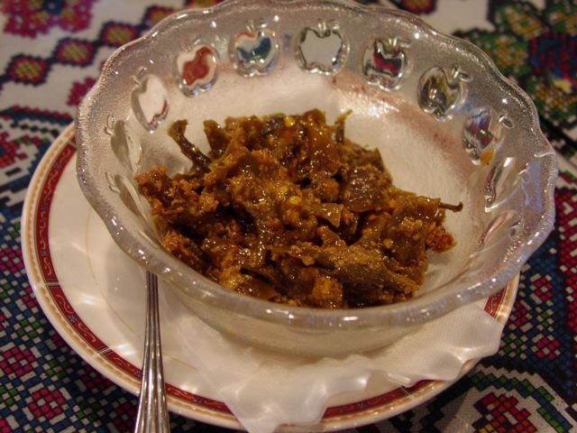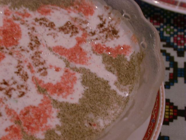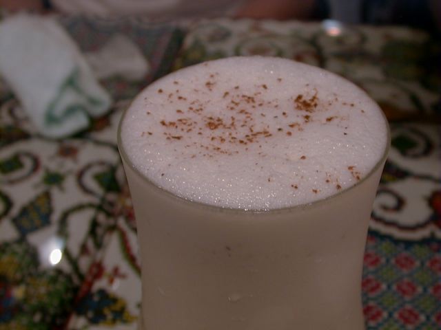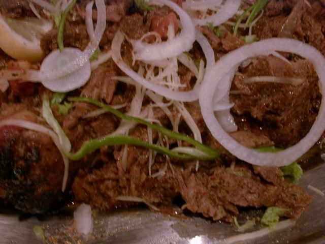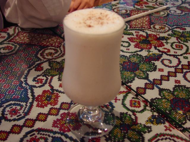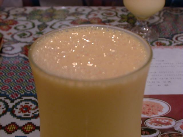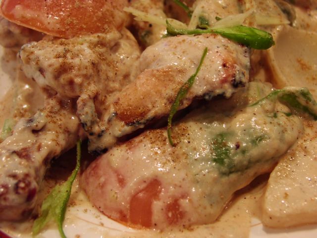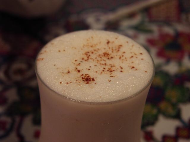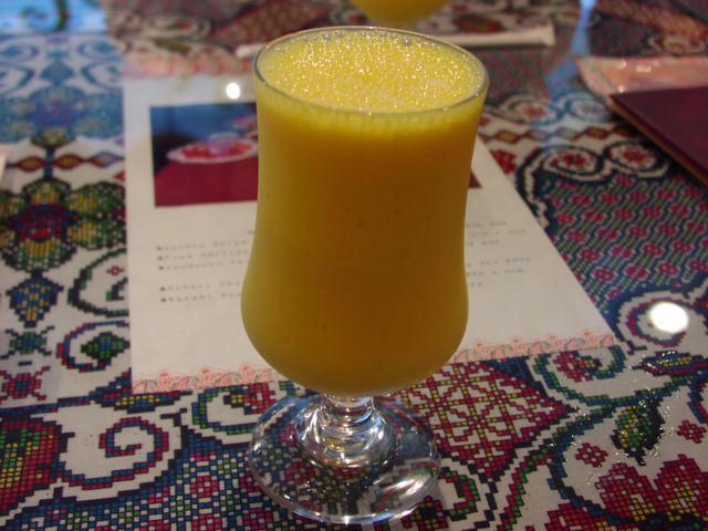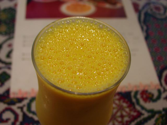 上にかかっているのは少し粗く挽いたクミン。カプチーノのようにふんわり泡だったラッシーの上にシナモンのごとくふりかけられてました。でも混ぜるともっと茶色い粒々が混ざったので、かなりな量が入ってるようです。塩加減は個人的にもう少し抑えてある方が好きです。他のメニューが肉料理メインでちょっと塩分とりがちになるから飲み物は甘いラッシーにしとけば良かったかなぁと思いました。(az)
