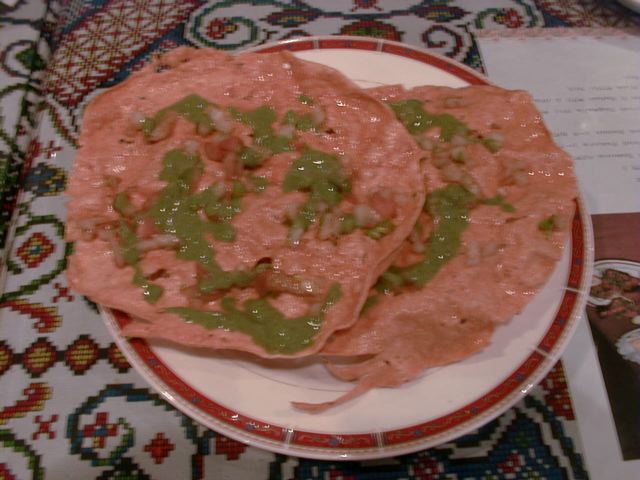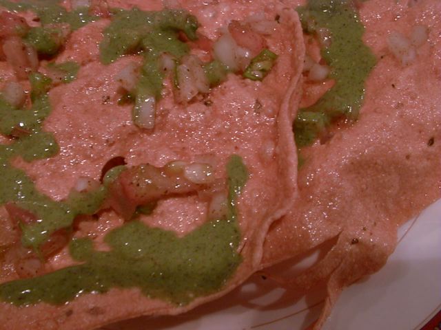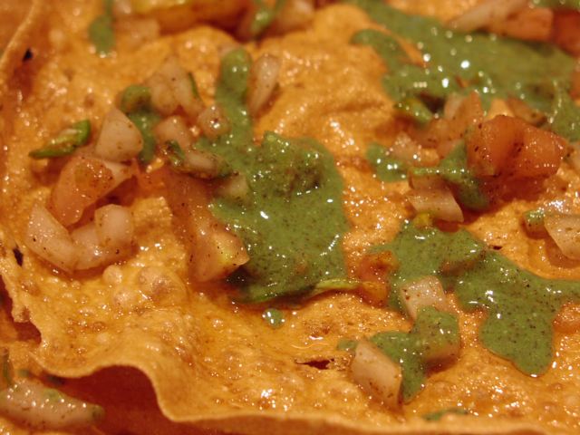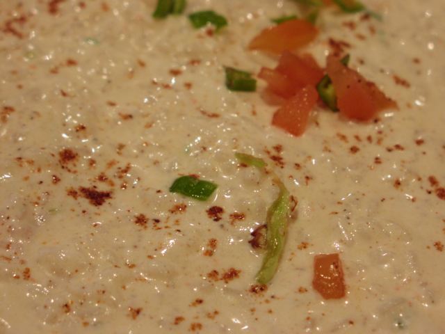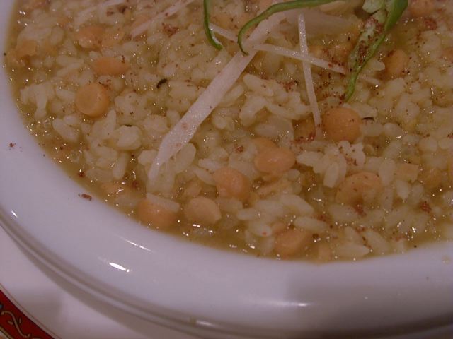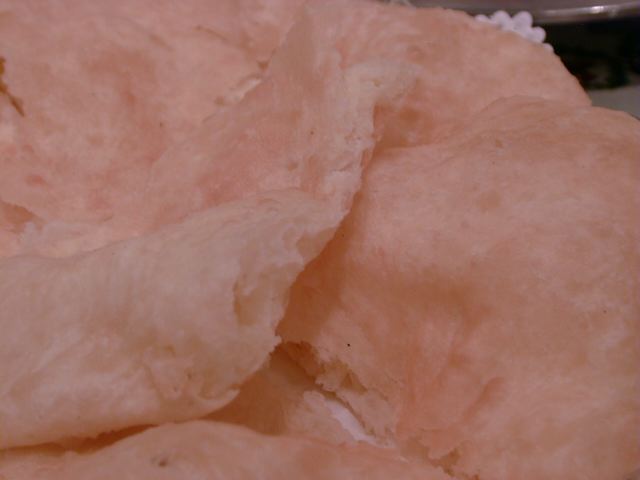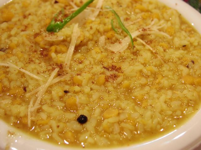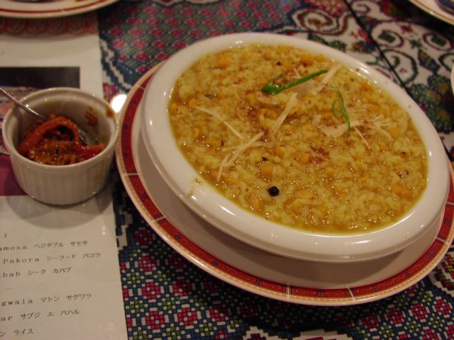 - おじや風ということでしたが、まさにその通り、日本のおじやって鶏肉や鰹だし使ったり、鍋物の最後を使ったりなどで、動物性タンパク質のエキスをベースにすることが多いけど、これは純粋にベジのみで作られているのではないかなぁというあっさりした優しい味です。ほくほくした豆がいっぱい使われてるし、日本米を使ってる為、一人で食べるとおなかいっぱいになっちゃうでしょうから、人数揃った時にお試しするといいと思います。この店のメニューではかなり淡泊な味付けです。唐辛子のピクルスやライタと混ぜ合わせて食べるとバリエーションが楽しめていいですよ。プレーンなパパドがあれば、くずして混ぜ合わせたいところですが、注文したマサド・パパドは混ぜてしまうには、ちょっともったいなくって、できませんでした。(az)