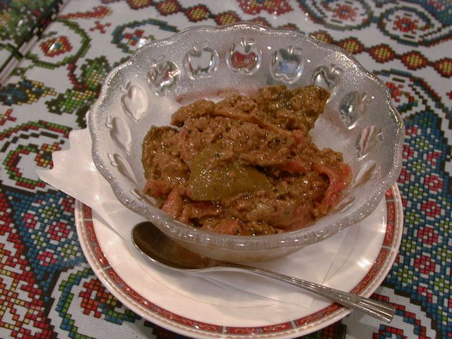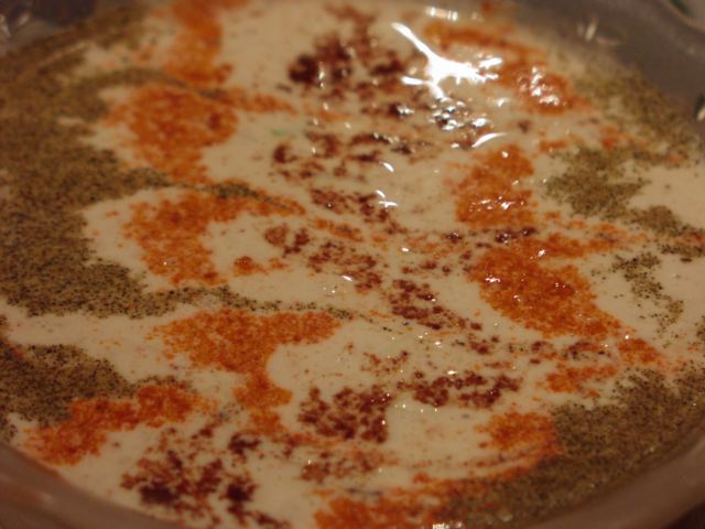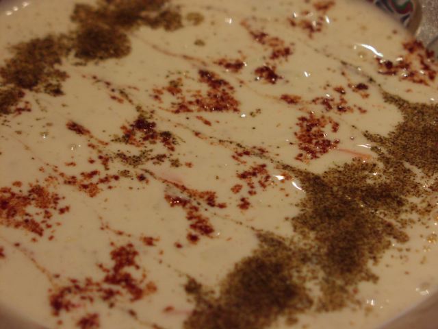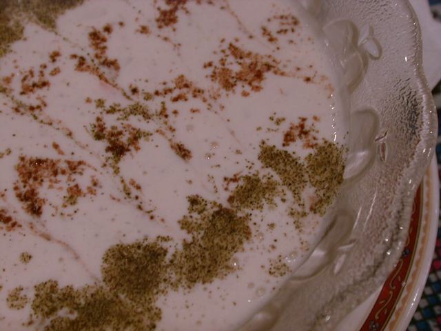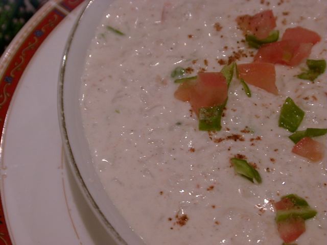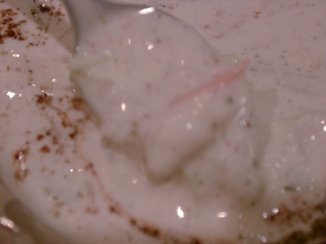 ランアリシャンと同時に新たに作ってもらったライタなのですが、あまりにも塩辛かった為、途中で調理人さんに「この塩っぱさが本来提供のライタなのか?」とたずねたところ奥に下げて作り直してくれました。特に交換しろと抗議したつもりはなく、全注文メニューを出し終えた頃に調理人さんが「お料理はいかがでしたか?」と聞きにみえた時に「大いに満足させてもらった。だけど、これ(こっちのライタ)って、すごく塩っぱいけどこれが普通なのですか? ちょっと味見してみてもらえませんか?」くらいに気軽に言ってみただけなのですけどね。そのメイン調理人さんによると、そのライタは、新しく入ったばかりの調理人さんが、配分を間違えたらしいとのことでした。勿論作り直してもらった分は塩味も強くなくおいしかったので、きちんと完食させていただきました。(az)