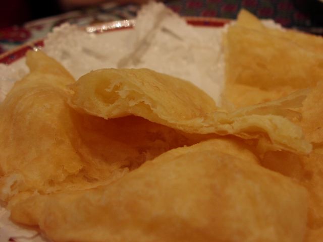 - きれいな油を使っており、揚げたてなのでやはりおいしいです。ここの生地はわりと厚めですので、パンっぽさが多いので私としてはうれしいです。生地が厚いって事は揚げ時間や温度を間違ったりすると簡単に油を吸ってじゅぶじゅぶになってしまいますので、薄手のタイプより扱いは難しいはずですから、こんな風においしく揚げられるお店の存在はうれしいです。(az)