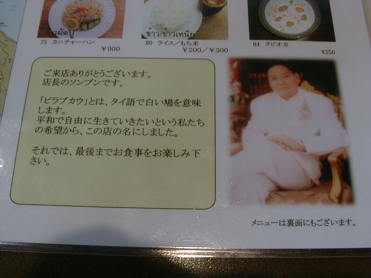 メニューに載っている店長のソンブンさんの写真と挨拶の言葉。
