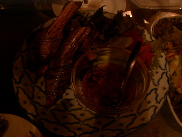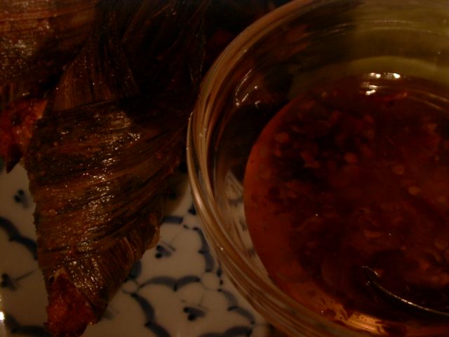 - 香草に包んである意味がいまいち不明(香りがうつってない)だけど、見た目が美味しそうに見えるんでいいんではないでしょうか?スィートチリソースがとろっとしてるのがめずらしかった。(よ)