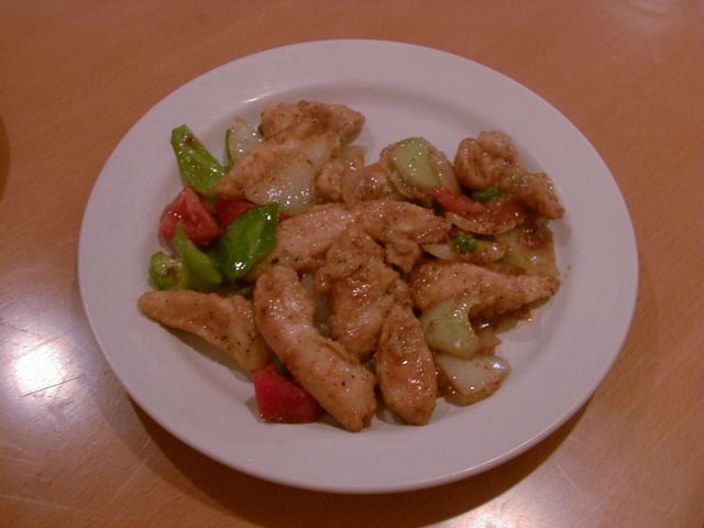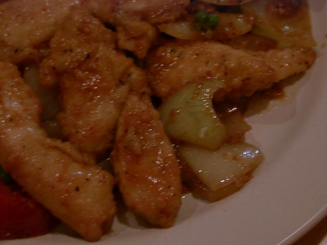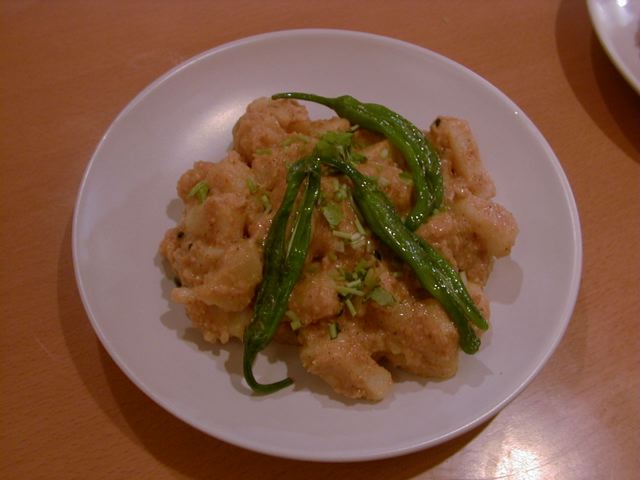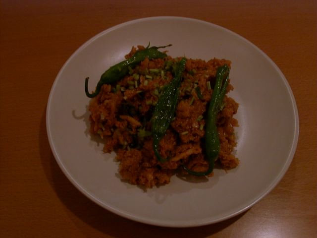 - 私たちとテーブル一つはさんだ向こうの席に、ネパールの方が加わっておられるグループが居て、他のメンバーにお料理についていろいろ解説していたので、ついつい私たちも耳をダンボにして、ちらちらテーブルの様子を見ていたのですが、あちらでもチキンチリを頼んだとみえて先に運ばれてきました。しばらくして私たちのテーブルにもチキンチリが来たのですが、先ほど見たお肉の色とは明らかに違ったものだったので、メニューを見直して類似したメニューか?と調べてみましたが、さにあらず。向こうに運ばれたチキンチリの鶏は「酢豚」のような色味でしたが、私たちのはずっと白いものでした。納得がいかず、後日違って見えた理由をうかがったところあちらのお客さんからは「思い切り辛くして」との依頼が注文時に出ていた為、私たちと同時に注文受けたけれど、鍋を別にして調理したのだそうです。いやぁそうと知っていれば私たちも同じくベリーHOTにしたものをとちょっと残念に思ってしまいました。隣の芝生というのも多分に含まれるでしょう(笑)。使われているのはなんと「ササミ」。大きいサイズのまま入っています。非常に淡泊な仕上がりになってるし炒めの油も控えめでしたので、一般的なチキンチリを求める人にはちょっと大人しく感じると思います。かくゆう私ももう少し油ののった部位の方がうれしいタイプです。ササミは、ぱさつき易いし、至極淡泊なので、もし一人で食べるのだったら最後の方は飽きてしまうかもしれないなぁと思いました。(az)