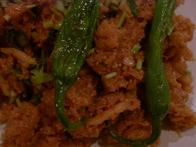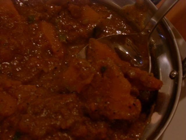 - 私がこれまで食べてきた大根のアチャールの中で、このお店のものが一番(この日まではシャンティマヤが一番)気に入りました。メティとたくさんのタマネギのみじん切りとやはりかなり小さくカットされた大根(&すり下ろしも加わってるのではないかなぁ。)が、しっかり漬け込まれておりうんまいです。スリランカのポル・サンボールを思わせる色や形状に、テーブルに届いた瞬間「これは何?」と思ってしまいました。口に運ぶ瞬間ジャスターゼの香りがプンと香り食欲そそります。ゴロゴロした角切り大根の食感が好きでぼりぼり食べたいって方だとこちらのは物足りないかもしれませんが、ご飯にしっかり混ざり込ませるにはとっても向いてます。自分ちにも是非常備しておきたいアチャールでした。(az)