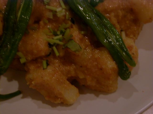 - メニューにはありませんが、ネパールならではのお料理ということで私らともう一組のお客さんにサービスしてくださいました。きれいに黒皮がのぞかれた豆の緑色がきれいです。生地は山芋入りお好み焼きをさらに柔らかめにもちゃっとさせた感じです。私はこの生地のカリっとした部分と中のむちゃもにゅっとした感じがに至る歯ごたえの変化が好きなのでした。注文してすぐできる品ではないので、もし食べたい方は事前に予約が必要だと思います。