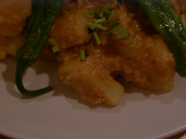 - こちらはよく見かけるタイプよりちょっと大きめでちょっと不揃いなサイズのじゃがいもです。香草たっぷりでさわやかな香りもいいし、塩加減も、ごはんが欲しくなります。しっかり茹でられたじゃがいもなので、わりと楽につぶれます。あぁ、ここでねちゃっと手でつぶしてご飯と食べたい!っと思って、後にとっておいたのですが、ご飯がきた頃にはすでに満腹状態だったため、ウォーやプーリーと一緒にいただきました。(az)