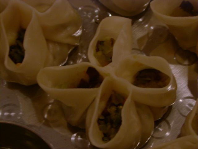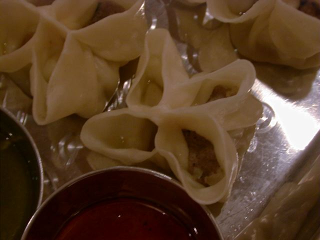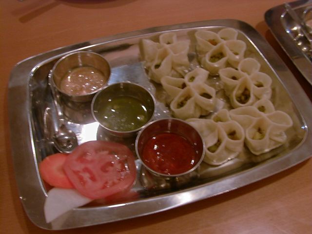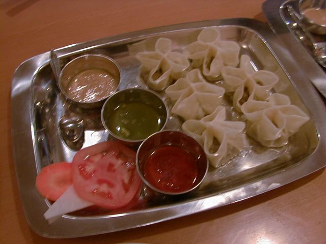 - ネパールの有名レストラン「ガングリ」の名物メニューで、餃子と焼売の中間といった感じと説明を受けました。一皿に4個入りで3種のソースと共に出されます。ソースは、赤=酸味の効いたトマトソース、緑=爽やかなグリーンチリソース、クリーム色=ピーナッツソースです。