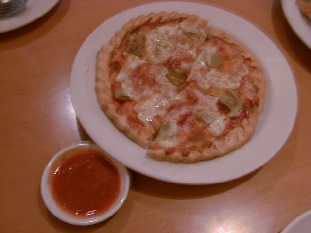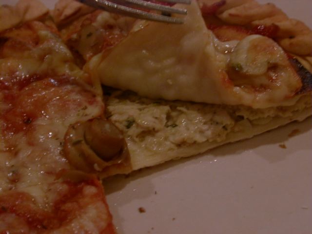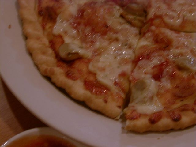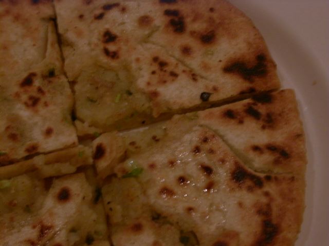 - トッピングは、見た目から想像するとおりのピザ風の味です。ガーリックの効いたチリトマトソースととろけたチーズのようです。生地の自体も小麦を使ったピザ生地に近いものと見受けられましたが、クラストがカリっと揚がった感じに仕上がっていることから、多めの油の中で半ばひたし気味に火を通したもののようです。縁取りにきれいな縄目状に飾り付けられた生地は、形のせいもあるでしょうが、ちょうど中華菓子の「麻花兒」(胡麻油を使ったねじり棒のクラッカー)のようでした。だからといって、全然オイリーな感じはなく食べやすいですが、なんとアルロティのように生地の中にも具が入っていますので、思ったよりお腹にたまります。(az)