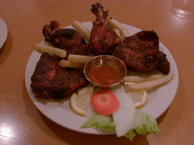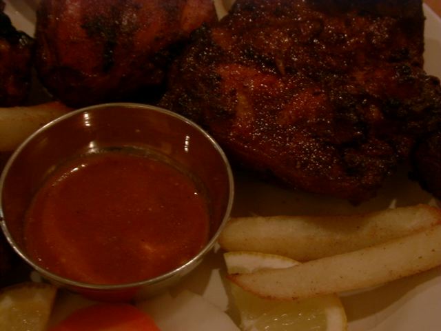 - スパイスにつけ込み焼きあげたチキンをさらにもう一度スパイスにつけ込んでローストさせたものだそうです。スパーシーではありますが、特別HOTではありませんでした。二度焼きなので、外側が香ばしく仕上がっています。そういえば、食べてる最中全員無言でした。(笑)(az)