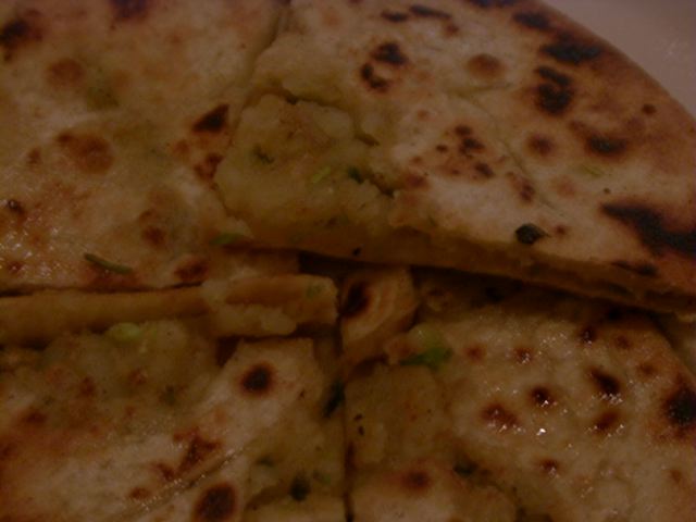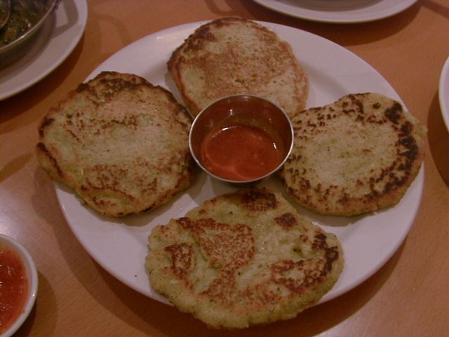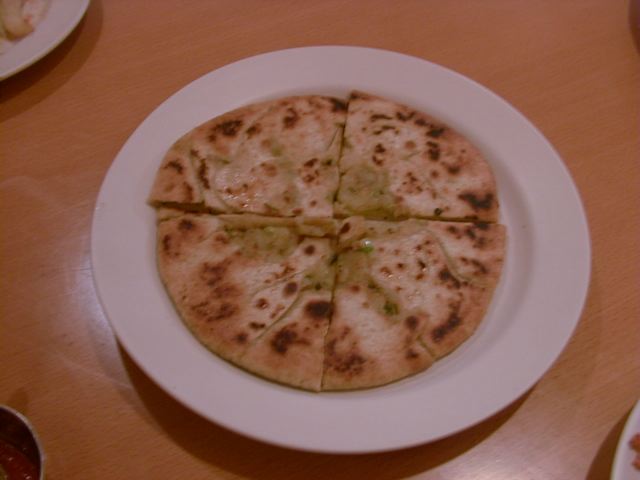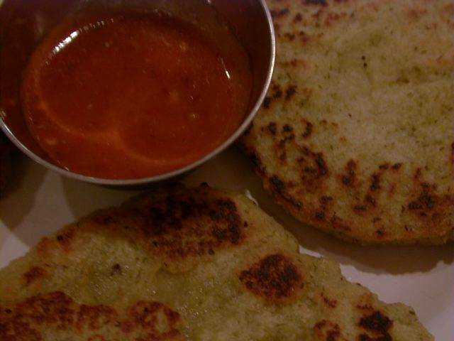 写真でもおわかりのとおり、卵や挽肉の入ったタイプではなくプレーンなものでした。これにガーリックチリソースをつけていただきます。この中央のソースはアルロティと一緒に出てきたものと同じで、かなりガーリックとチリとジンジャーが効いています。食べたすぐにはガーリックとチリの辛みがあるのですが、しばらくすると口の中に爽やかな感じと苦みがあります。この苦みは決してイヤな苦みではないのですが、メティのものとも違っていて、どうしても気になって後日お店の方に聞いてみたのですが、特に苦みの出るスパイスは使っていないとのことでした。爽やかさはジンジャーとして、苦みが謎のままです。(az)