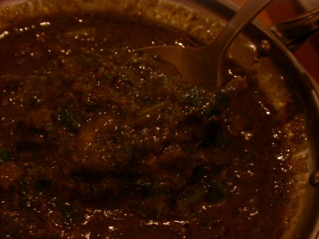 - 完全にスパイスや油と調和したペースト状のほうれん草のグレービーにほうれん草そのものもたくさん加えられています。ほうれん草の食感が好きな私としては、この両タイプ楽しめる形態での提供はとってもうれしいです。味はほうれん草の持ち味を出す為でしょう、薄味であっさりしていました。(az)