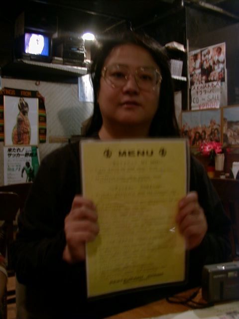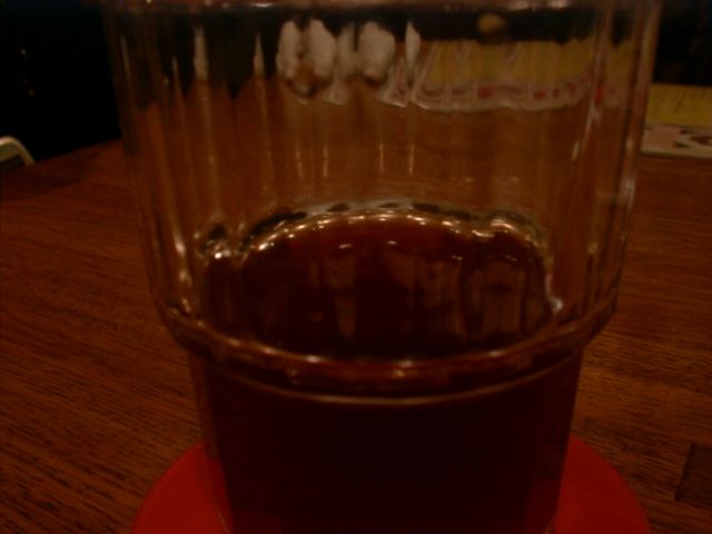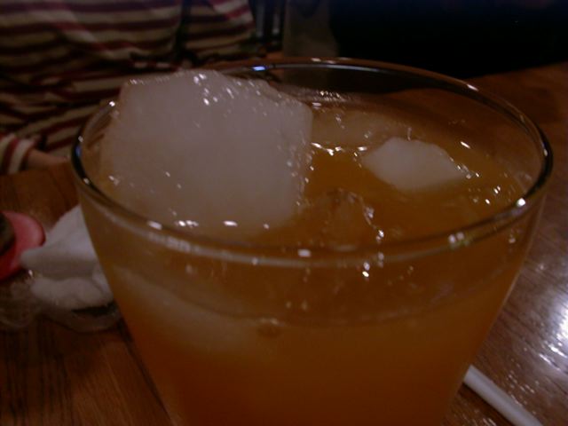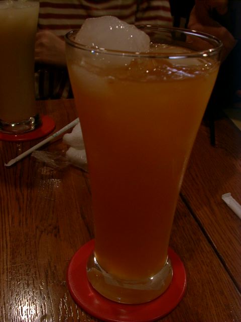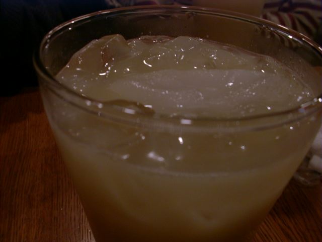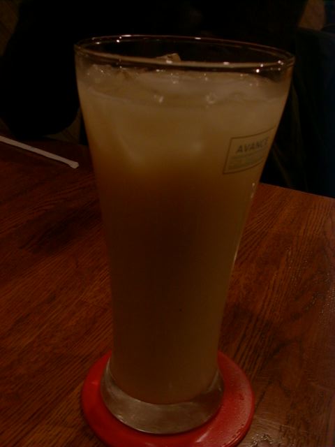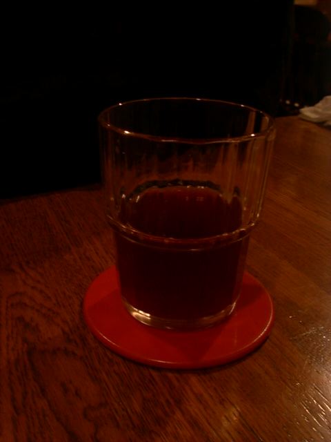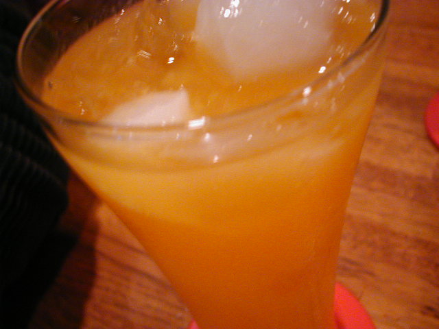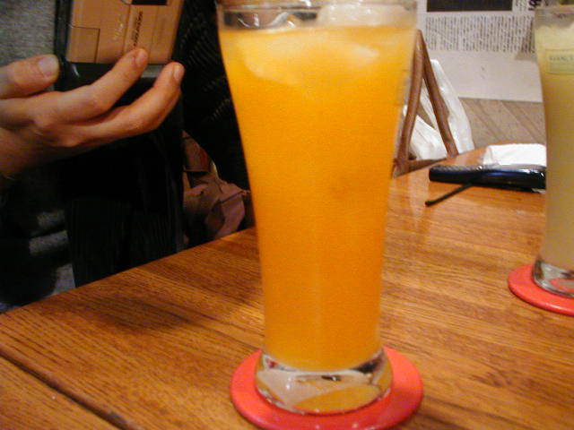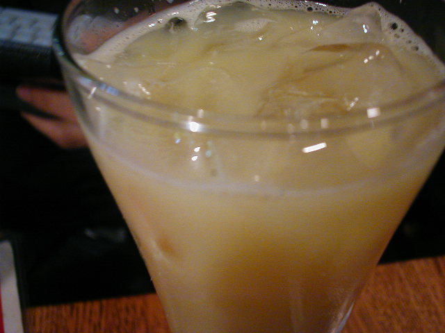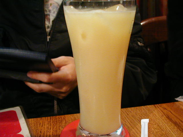 - 私はヨーグルトドリンクを注文したのですが、きらしてる(厨房の外で入り口隣にあるショーケースっぽい冷蔵庫を確認してました)ので、私もこれにしました。すごく辛いのでやめた方が良くないかとは忠告されていたのですが、アメ湯程度だろうと考えてましたし、どちらかといえばジンジャーエールみたいに軽いのでなければいいがなぁなんて心配をしてたので、問題ないとお願いしたのですが、実にかっらいかっらい。喉にビリビリきますし、勢い良く飲むと咳こむは涙出るわのショーゲキ! ネーミングを「ショウガの絞り汁100%」とか「まるごとショウガ汁」とかにした方が相応しい感じで、その分すっごく体に良さそうな飲み物です。一見果汁100%のグレープフルーツのようですが砂糖は入ってないし、注文する人は前述のとおり「濃い」ことを熟慮することをおすすめします。(az)