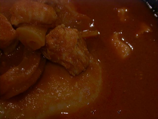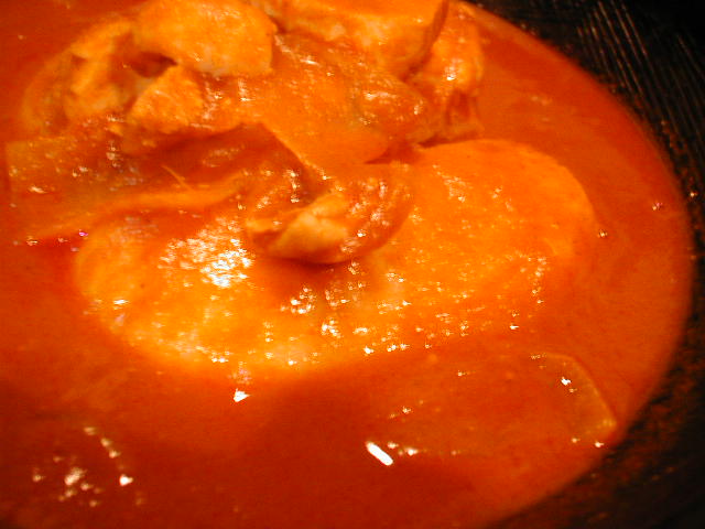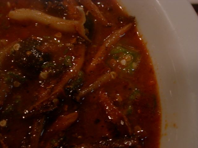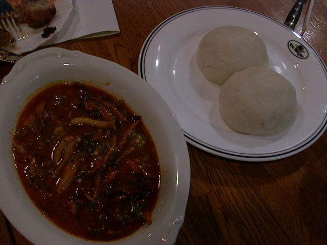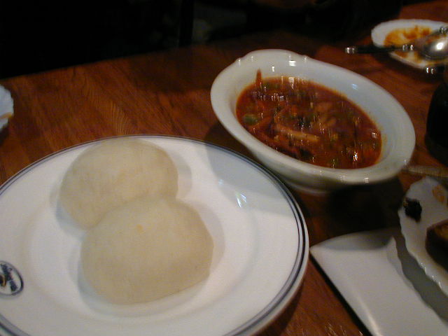 - フフはとうもろこしの粉で作ったものだそうです。色は白っぽく米粉で練ったような感じですが、味わうととうもろこしのほのかな甘みを感じます。片栗粉で作った日本のお団子ときりたんぽの中間の食感といいましょうか。粘り気とまではいきませんが、もにゃーっ(笑)としてます。私もめしさんもこの手のものに惹かれるタイプのようで妙に気にいったと連発しました。スープのベースはパームナッツということですが、椰子の実から受けるナッツオイルたっぷりのくどいタイプを想像してましたが、あっさりとして飲みやすいものでした。フフとも良いけど、パラパラの軽い長米とも相性良さそうです。(az)
