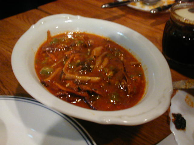 - かなりねばりが出ています。見た目は小アジくらいの煮干しのような味と食感の干し魚がたっくさん入ってます。煮干しと表現するようにほんのちょっとの魚のワタの苦味まであって旨いです。魚臭いのダメって人には不向きかもしれませんが、いりこ出汁の味噌汁のいりこをぼりぼり食べれる人ならおいしいと思います。みなさんすでにおなかいっぱいだったのか単に好みでなかったのか、私が半分以上食べたかもしれません。(az)