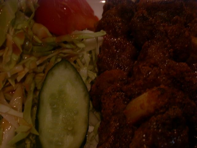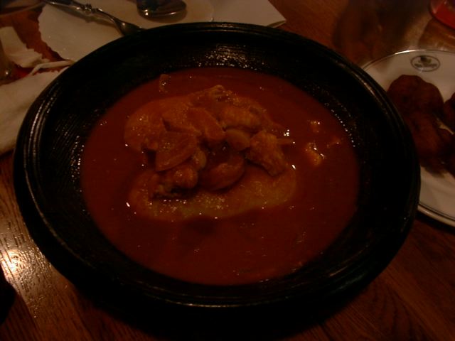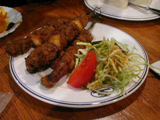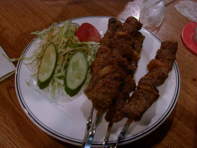 - ショルダーとかの部位なのでしょうか、真の「肉好き」にはたまらないお肉だったと思いますが、私は固いお肉は不得手なので一個だけいただいてギブアップ。でもお肉の周りにびっしりついた漬け込みのスパイスはとてもおいしかったので、串のタマネギの方を狙って食べてました。それと下敷きの野菜を。(az)