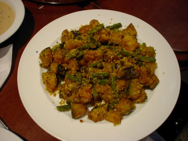 - それぞれ色や性格の違う野菜が拍子切りで同じ長さに揃えてあり、見た目も鮮やかで食欲をそそります。ジャガイモを使ったサブジはこれまでも色々いただきましたが、この組合わせはそれぞれの野菜の食感の違いが面白くて気に入りました。(az)