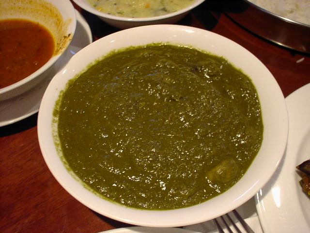 - ピューレされたサグは、チジミホウレンソウという、地を這うように伸びてくる、少々変わったホウレンソウ。マッシュルームも加わっており、この味が効いている。ホウレンソウの味が、なかなか力強く味わいが良い。食べた後も、くどく残るようなことはない。(ina)