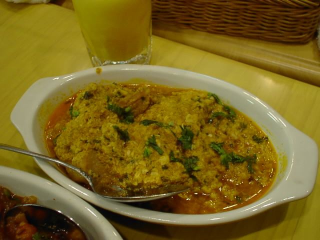- チキン・モグライというと、たとえば「櫓」で幻と言われているホワイト・カレーがそうでしょうな。モグライ・グレイビーって結構リッチ・テイストな感じがするはずなんだが、そういう感じがしなかった。ナッツ、ヨーグルト、生クリームを使用して、まるでチキンのクリーム煮のような濃厚ながらもカルダモン、シナモン等がかぐわしく、カスリ・メティの独特の香りがする、時々食べるにはナイスなものを思い浮かべていたので、ちょっと困惑気味。レシピの違いはあるのだろうが、それにしても...良く見ると、グレービーが煮詰まってないというか、トロッとした感じでは無く、わずかにシャバッとしているというか、ゆるい感じがした。だからなのか全体的にぼやけてしまってるのかな。やけに卵の味が印象に残っている。(ピ)