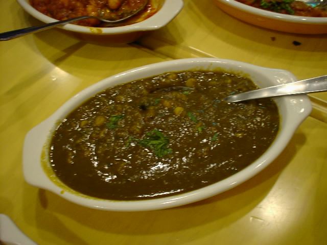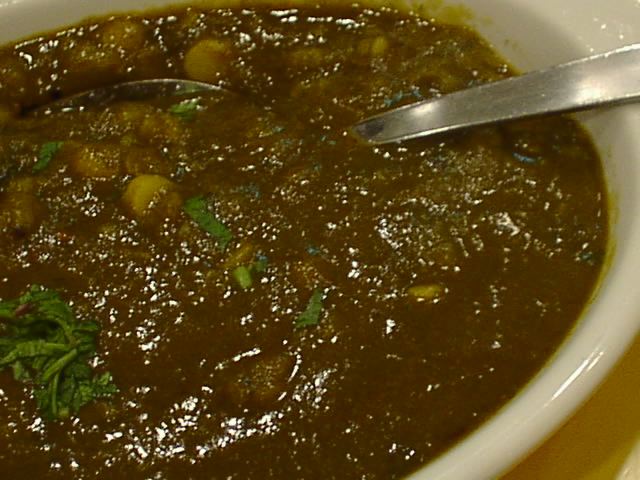 - メニューの説明には、大豆をスパイスで味付けした料理と書かれているが、実際のところは、ムング・ダル、チャナ・ダル(挽き割り)にパラク=ほうれん草を一緒に煮込んだもの。見た目に緑色が全体を支配しているが、これはもちろんほうれん草。それをピューレしたものを加えている。ただしほうれん草の量が多いためか、肝心の豆の味がほとんど感じられないのが残念。(ピ)