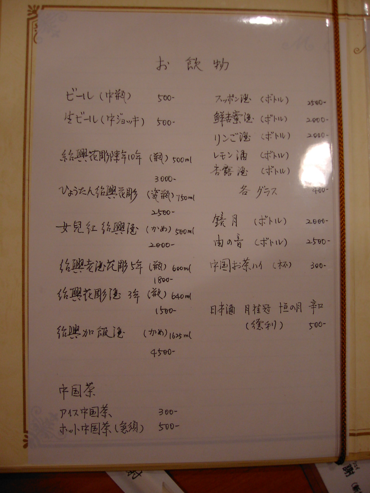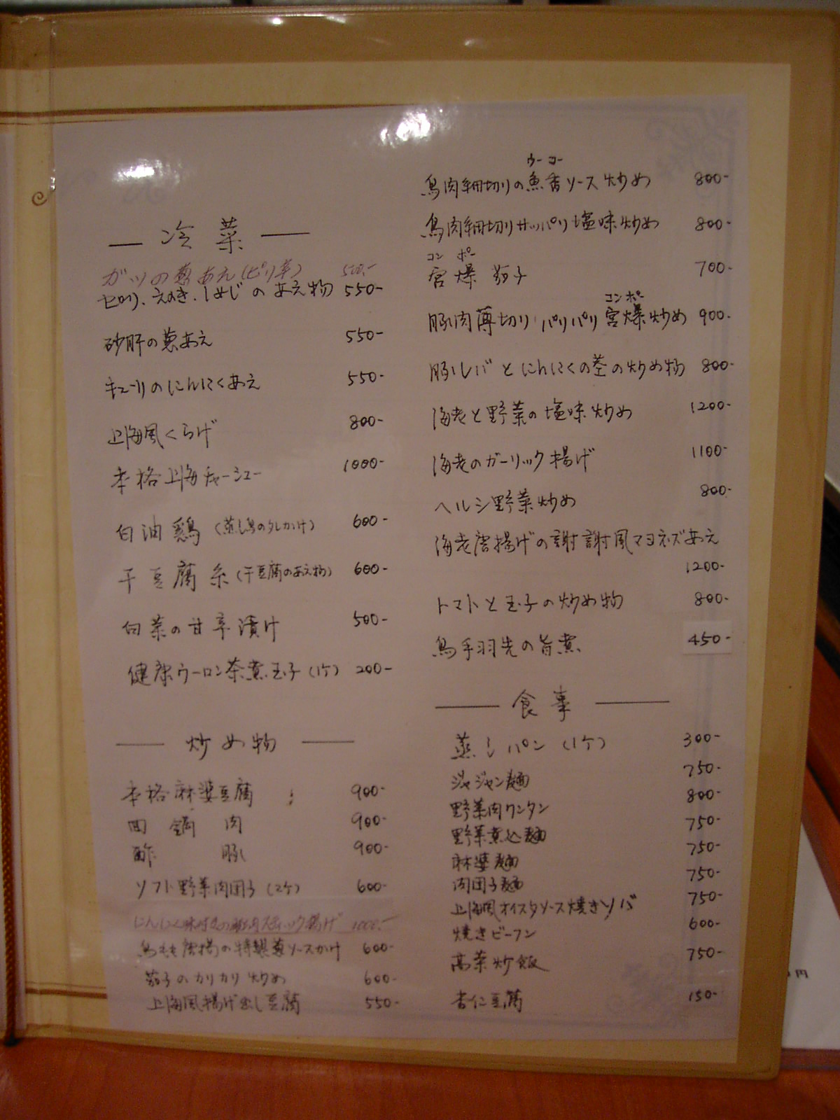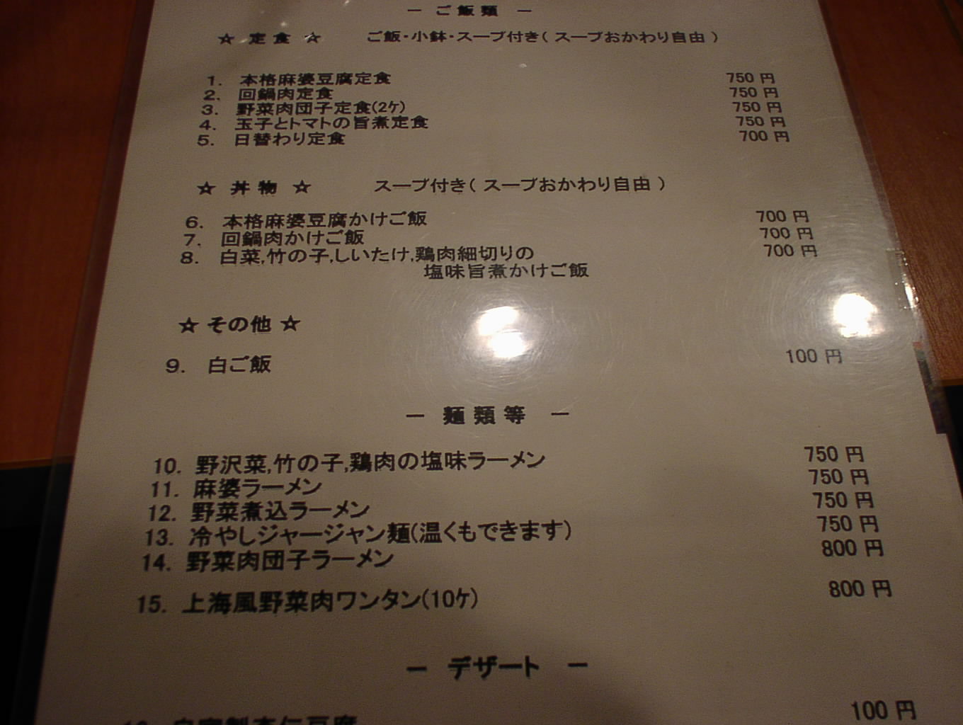 夜のメニュー(2002/7/2に撮影)