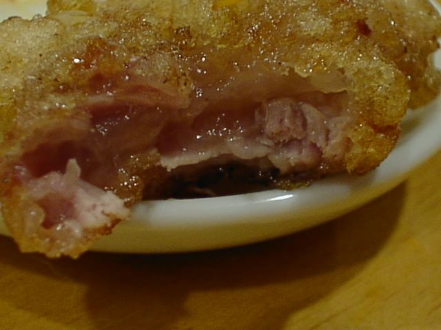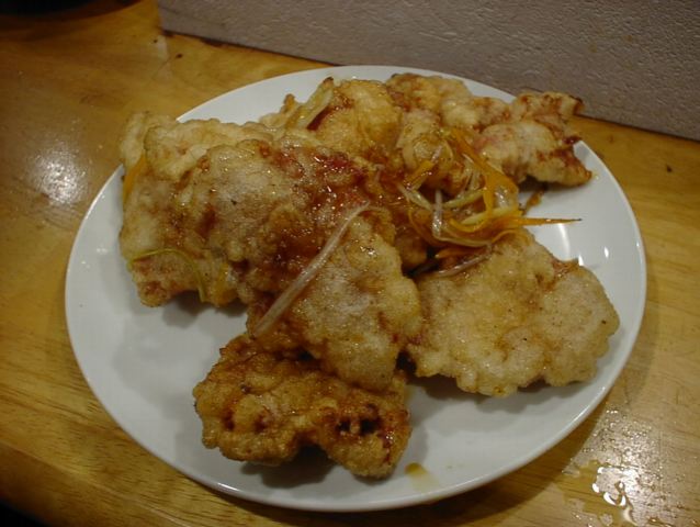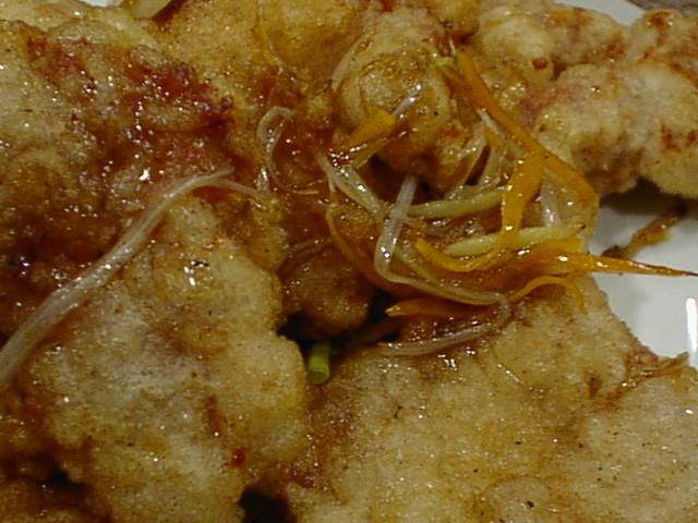 - 豚肉のてんぷらなのですが、衣がむっちり弾力があって美味しいです。あげたてでアツアツ。個人的に今日のベスト料理かもしれません。(い)
