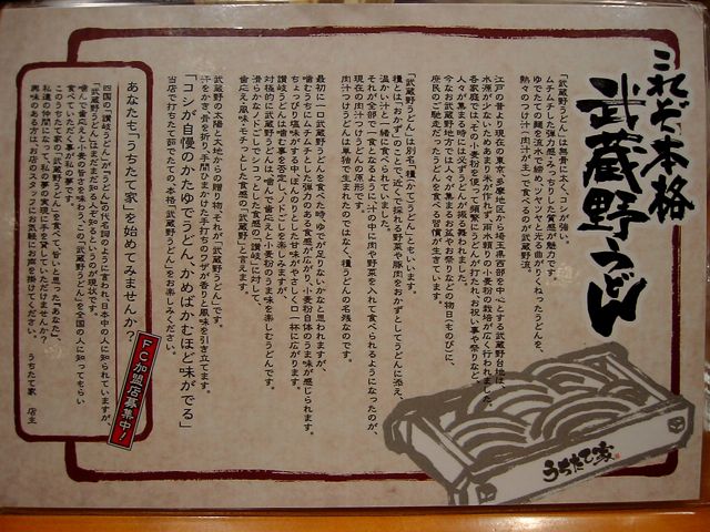 「讃岐うどん」ばかりが有名になってますが、この武蔵野うどんもとても美味しいです。「さぬき小町うどん」と比べて、値段の差だけのことは十分ある、という感じでお勧めです。入り口で食券を買うシステムになっています。(JK)