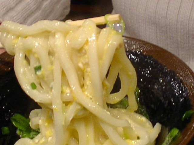 - オーダーすると新たにうどんを茹でてくれるらしく、5分ほど待ちます。全てお店の人がやってくれるのでセルフを経験したい人には物足りないかも? 溶いた生卵に既にダシ醤油も入っている上に茹でたてのうどんと葱。かき回してから啜ると想像以上にズルズルと卵が絡みます。卵もちゃんと生の状態のままでgood。(煎り卵状態にはなってない!)うどんの腰も他のメニューよりもしっかりしていて美味しかったです。(ひ)