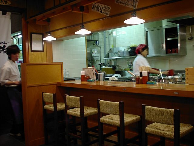 店内に入る前に食券を買います。でもメニューがちょっと想像しにくいかも? 大テーブルとカウンターのこじんまりとしたお店。(ひ)