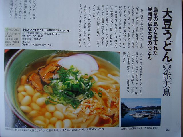 機内誌をパラパラ見ていると瀬戸内の話題に能美島の郷土料理「大豆うどん」の話が載ってました。