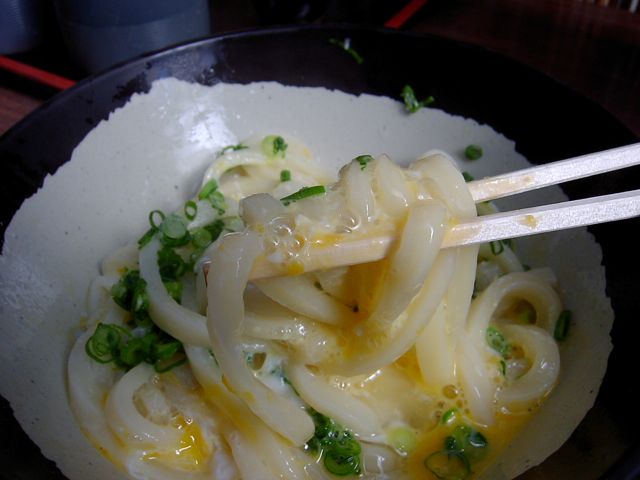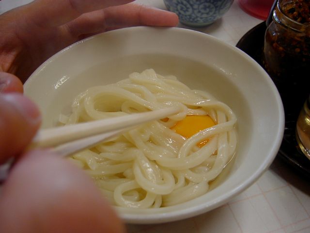 今回一番来たかったお店!玉子はあらかじめ何かで割っているのか固まらず、生玉子状態をキープ。ツケダシと濃口醤油など自分で好きに味付けします。うどんのモチモチ感といい、ズルズルっとした喉越しといい、やはり絶品でした!濃口醤油で味がグッとしまりました。(ひ)