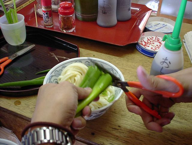 お酢と青唐辛子を入れて、うどんの気分転換ができました。(鳩/あついの)