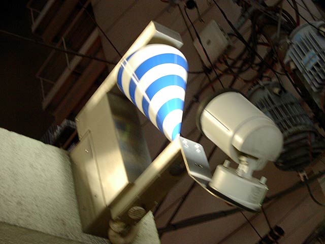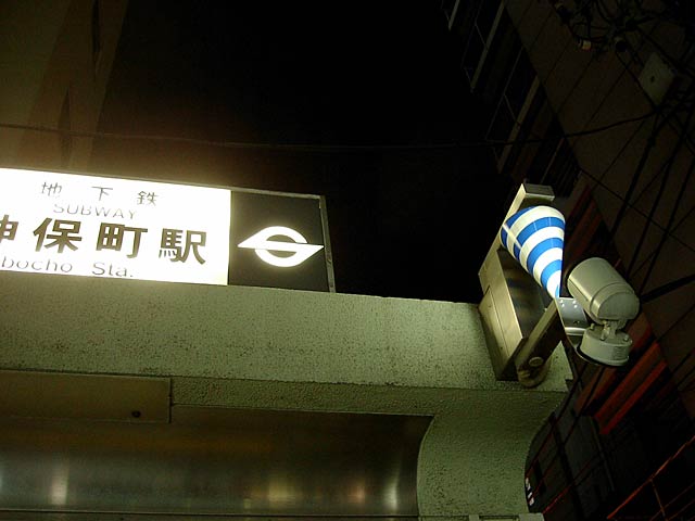 ところで、帰りに地下鉄神保町駅の入り口上に不思議な物体があるのに気がつきました。青い部分がグルグル回ってます(床屋のみたいに)。これがなんなのかご存じの方、教えてください。(JK)