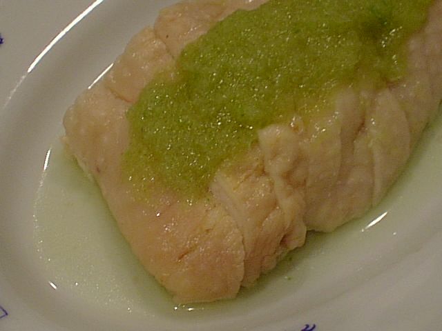 - 油っぽすぎずしっとり柔らかく美味しいです。上にのってる翡翠色のソースは何でしょうね?(JK)