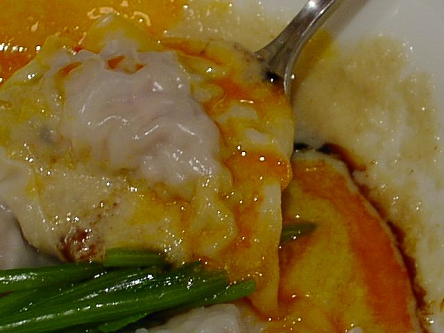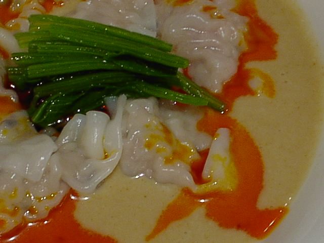- このワンタンはタレがちょっと変わっていて、醤油ダレの上にたっぷりとゴマダレ(芝麻醤にピーナッツを加えたものかな?)がかかって2層になっています。さらに辣油の鮮やかなオレンジ色が加わって、なかなか綺麗。ゴマダレがあまりにもたっぷりかかっていてワンタンの味が消えてしまうほどだけど、これはこれで面白い。(め)