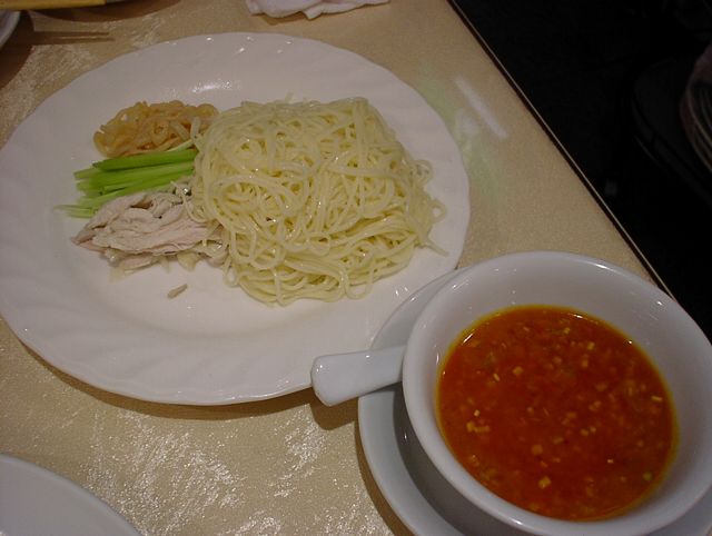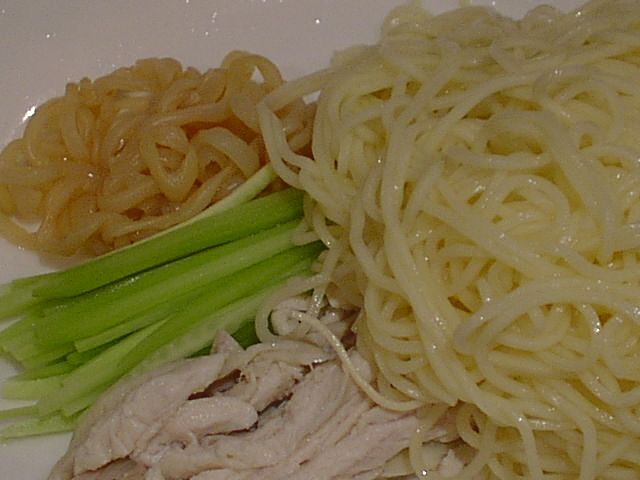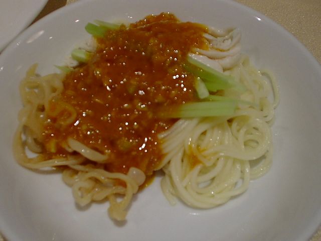 - 蒸し鶏、キュウリ、クラゲと麺が別々に盛ってあって、タレが別に付いてきます。最初から取り分けて食べることを考慮してあるみたい。麺が特徴的で、冷麺としてはめずらしくコシの弱いもっちりした麺(よく茹でたスパゲティみたい)です。甘めのタレ(醤油ダレの上に肉味噌ダレが重なって2層になっている)がよくからんで、やさしい味です。(め)
