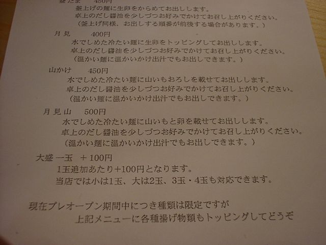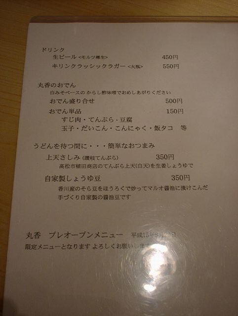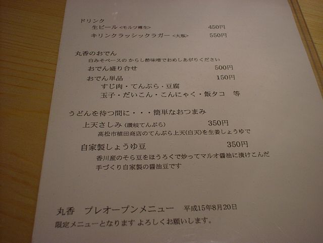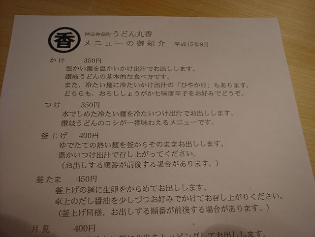 2003/08/23: うどん丸香(まるか)のメニュー